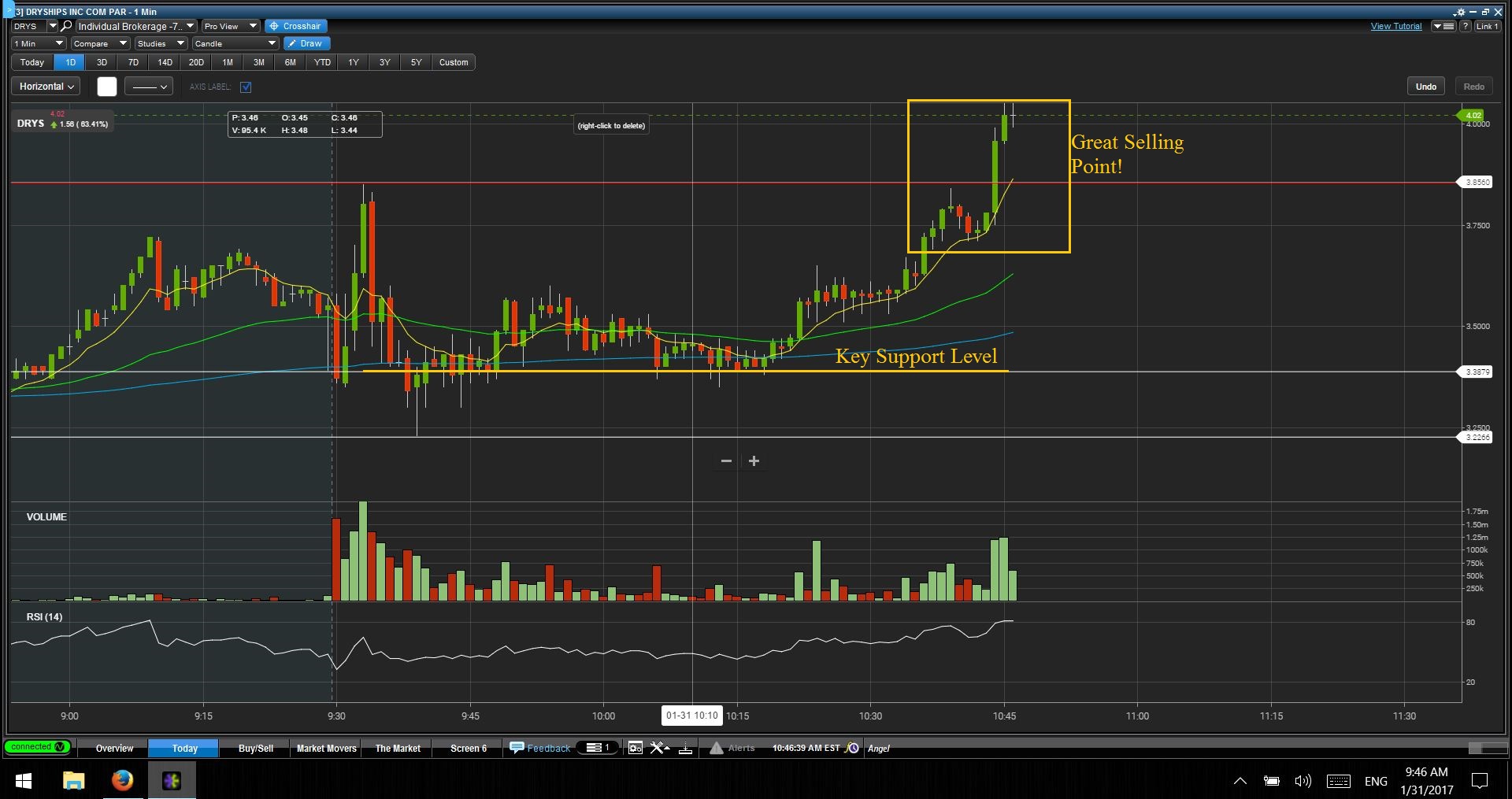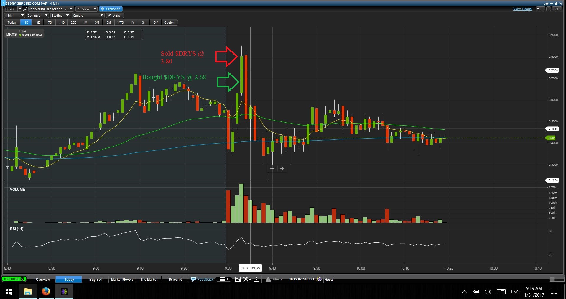 Instead I paper traded $DRYS at the market open thinking this stock could run. Not a bad thesis but I cut my gains quickly as I saw that this thing was not going to run. Bought at 3.68 and sold it at 3.80 for a quick .12 gain. Way too many sellers.