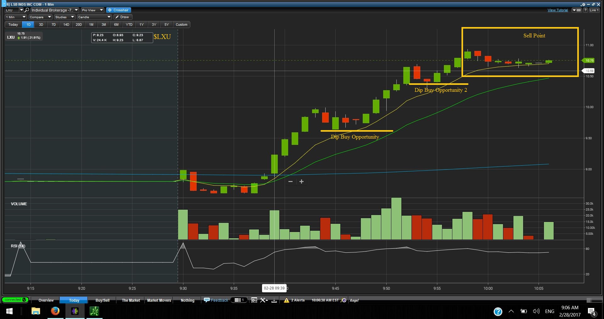$LXU definitely was a great play as well as it went up $2 dollars share from 8.90ish at open to 11 dollars now. I don't really much understand why this stock rose as they reported a loss on earnings but I definitely was not there to catch this one. It just popped up on my scanner but I was busy looking at other stocks to trade it. Plus it is a little pricey because I like to keep the amount invest under $2000.