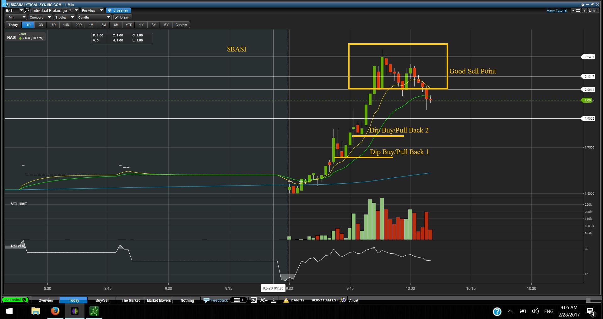 $BASI was the only stock that I was actually watching in real time breakout.I unfortunately I did not like this red market and all of these failed morning spikers So I didn't trade. I was definitely looking to buy about 500 shares of stock on the 1st pull back around 1.73 after it made a new high over the ticker. To sell it around the 2.00ish area or above 2.00ish. I also didn't buy the stock because this stock is kind of getting over extended now. Great Lesson.