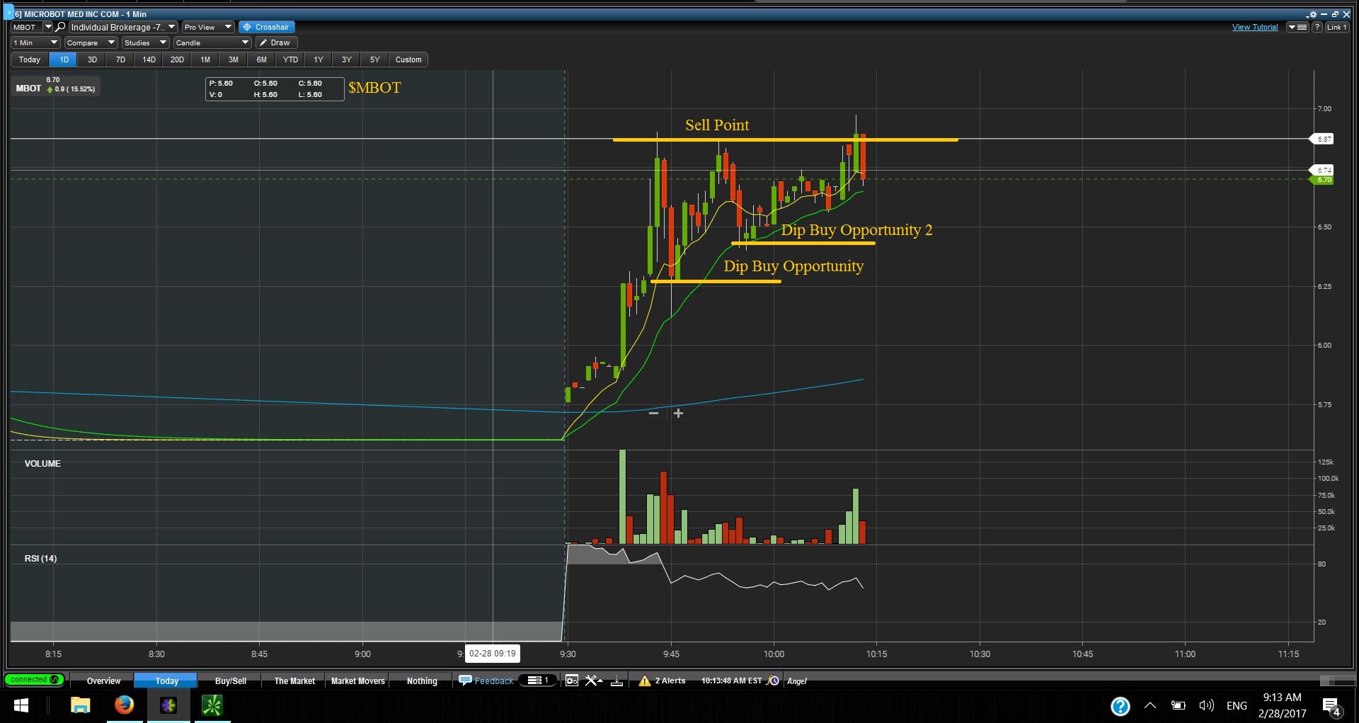 $MBOT I unfortunate was not there watching this stock when it dipped bounced. I was all the other failing stocks today lol. I did alert the chatroom in the morning this was an over all dip bounced caused from the 3 red days prior. I should've been looking at this setup. This thing is probably going to be a short now as it is a triple top and the volume has faded away.