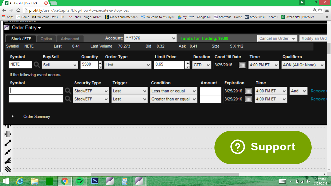 Hi guys. I do most of my trading on the ScottradeElite platform and was wondering if any of you guys knows how to properly place a stop loss. Do you know what I put in the lower conditions? I know you set the trigger to less or equal to .Plz comment if you know anything.
