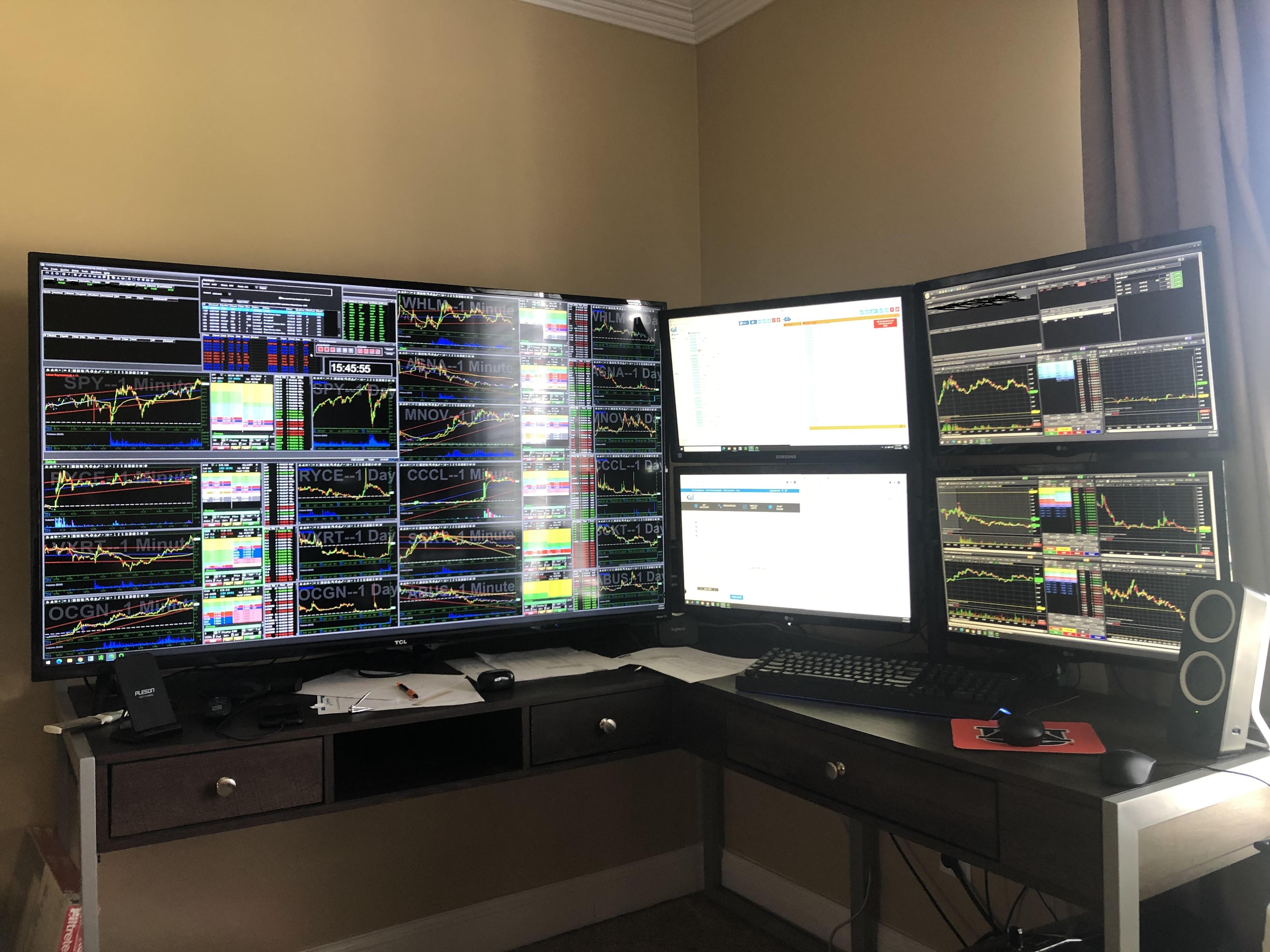 I've had several people ask about my trading set up. Here is a picture of my normal set up. 55" TV with DAS Trader running, two 24" monitors with chatrooms and 2 24" monitors with Trade Zero running.