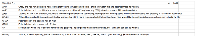 Watchlist for 4/11/16 (back into it) I hope this helps and happy trading! PS: again I'm sorry for not posting everyday, i am trying from now on when i have time Posted Apr 10, 16 9:22 PMbyBowlesTrader5Views 251 / 1Received 1 KarmaRiseAboveAll Apr 10, 16 11:56 PMThanks for the post!filllet2u Apr 25, 16 8:04 AMi was really liking your insight.... very helpful in my learning, i for one will be verry happy when you start posting again!!!Join now or log in to leave a comment