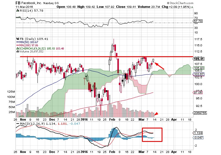 Notes: Ichimoku showing resistance in the current area and specifically at the 105 price. MACD is strong with volume and momentum. Event March 21st will be a factor to consider along with the swing of the down trend coming into April's earnings. RSI also showing uptrend. (Current positions for MAR & APR Long Call 110 Options).