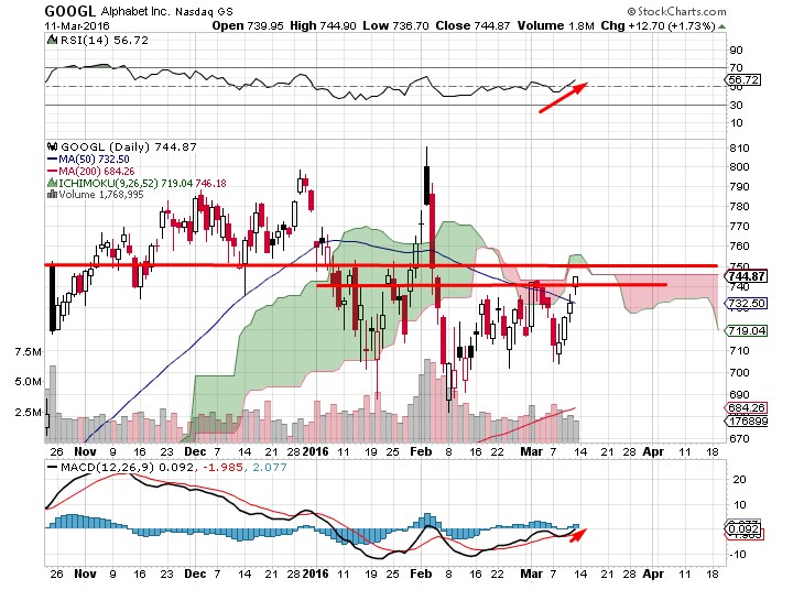 Notes: RSI has slowly bounced off the 50 mark however has now broken past and looks like an uptrend in RSI, MACD coming into bullish momentum with strong volume levels. Also has broken the 741-742 area of resistance and looks like to continue to 750 before seeing any more resistance. Cloud also has a peak of bullish area showing it could continue to pop through. 50MA has also been surpassed. The continued candle pattern of bulls might has 1 pull back but IMO the trend up is looking more favorable.
