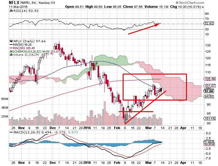 Notes: RSI showing good uptrend however MACD is a little concerning as the momentum is slowing down and transitioning into a possible bearish followed with entering into the cloud. If candle breaks the current trend up and continues down, the trend could follow the cloud bearish to mid to lower 90's into April. 50 MA also just crossed over the 200 MA. Bulls need to start pushing more within volume before we see NFLX improve.