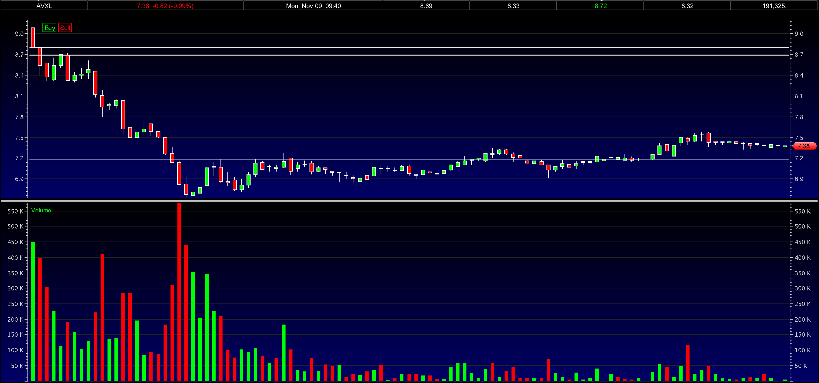 So this "play" was entirely hypothetical. No money was traded. With Tim's plans on AVXL in mind, I thought that i would decide to try and "play" into this play at 9.20. I figured as it was as it was falling as a pump that there is money to be made on the drop. Although this pump was backed by a powerful newsletter as Tim said, I kept the possibility of a short squeeze in mind. I was watching the level II and was trying to see if it would break 8.82ish on the bounce which it didn't. It pretty much steadily dropped until it hit the 6.60s, but I thought it would go lower, it didn't, It spiked to 7.15ish. I went "out" on that uptrend at a hypothetical 7.20 It hasn't done much since then. I would have profit if I was executed on or around those numbers, but this isn't real life. No money was traded. This was simply practice and was intended to learn from. Volume has since then declined as well and has been hanging around the high 6s low 7s like I thought it would based on previous support and resistance levels.