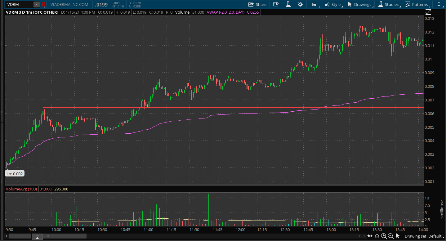 2. For morning trades, find those that spike and keep those on radar. Don't buy them right away but instead watch for that high to be put in and wait for a mini ABCD to form and look for the b/o over that high. I have noticed many OTCs that set a high and test it again and continue higher. Those are usually the stocks that last into the afternoon and potentially next day. Ex. VDRM (pic attached).