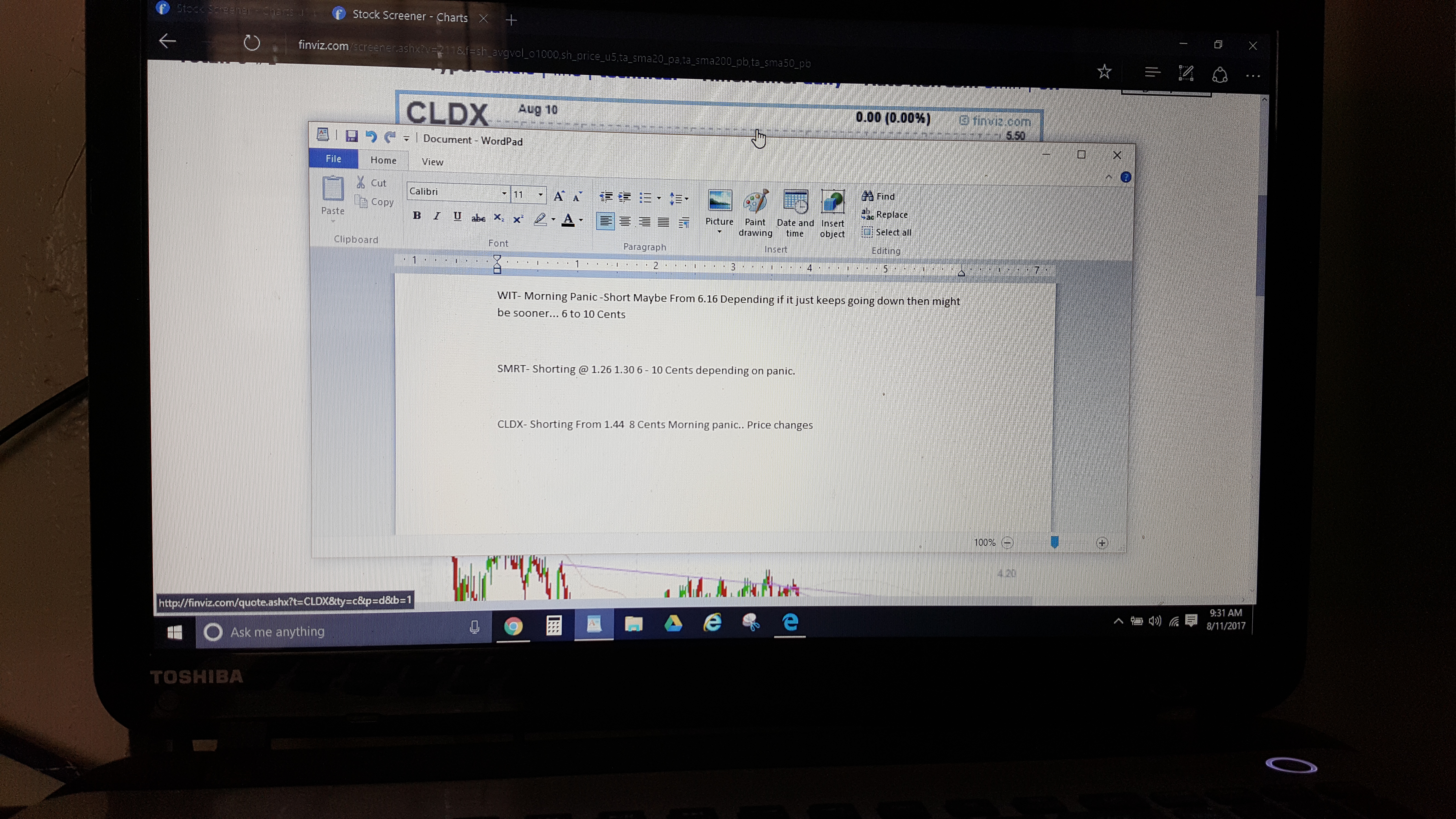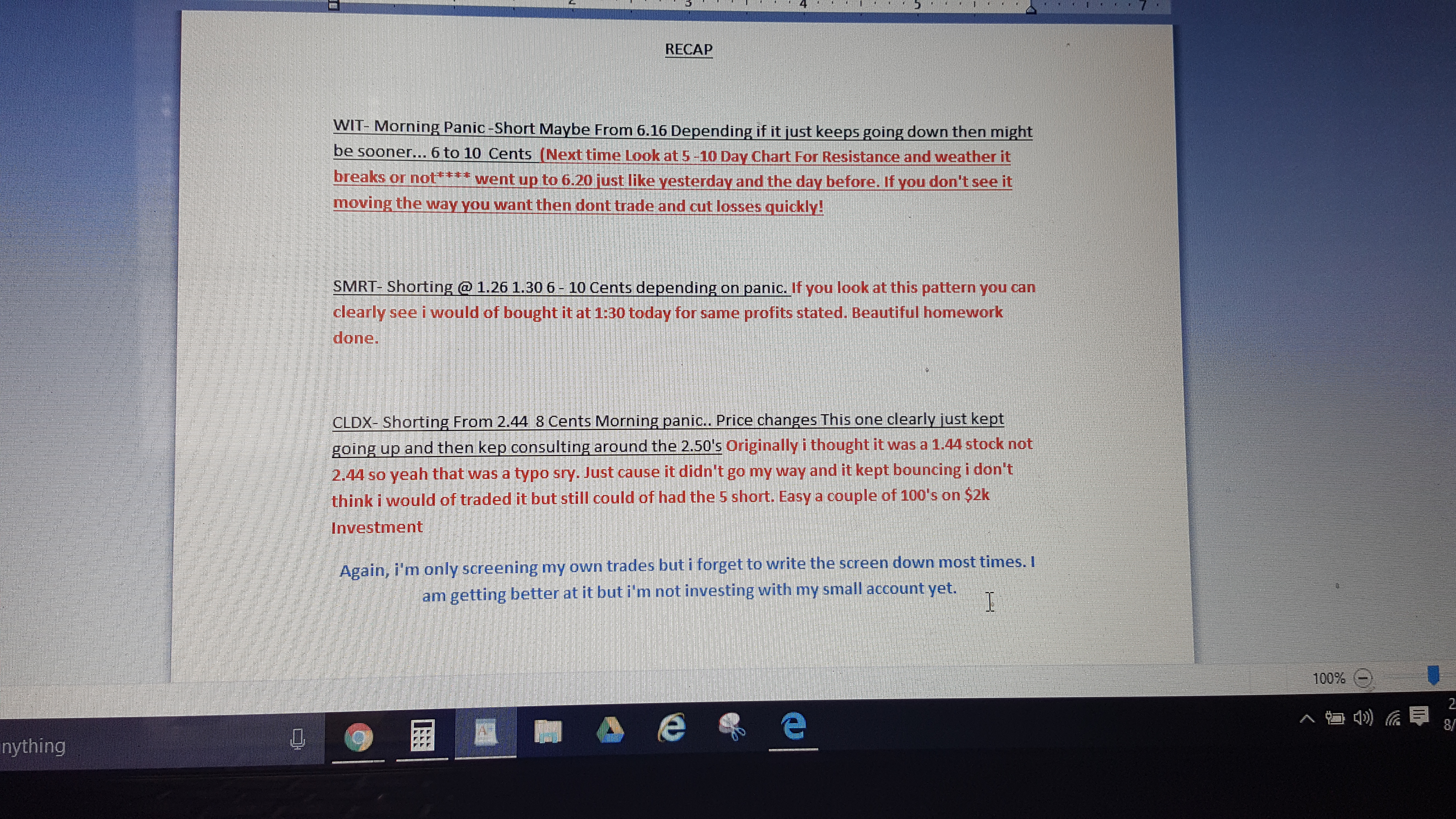 CLDX- Shorting From 2.44 8 Cents Morning panic.. Price changes This one clearly just kept going up and then kep consulting around the 2.50's Originally i thought it was a 1.44 stock not 2.44 so yeah that was a typo sry. Just cause it didn't go my way and it kept bouncing i don't think i would of traded it but still could of had the 5 short. Easy a couple of 100's on $2k Investment