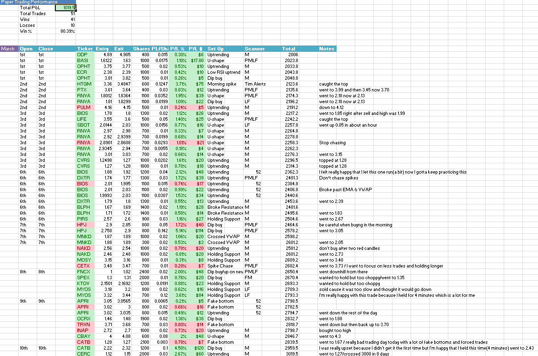 (MAR)- I became comfortable with a pattern(dip buying stock off of/above VWAP, EMA with low RSI. I started the paper account with $2000 and now I'm at $3019.5 in 8 days of trading with a winning rate of 80%. Now I want to focus on entering better trades and practicing holding longer cause I'm always selling before big spikes and missing a lot of profit. If I want to grow my small account I need to focus on trading less and holding longer.