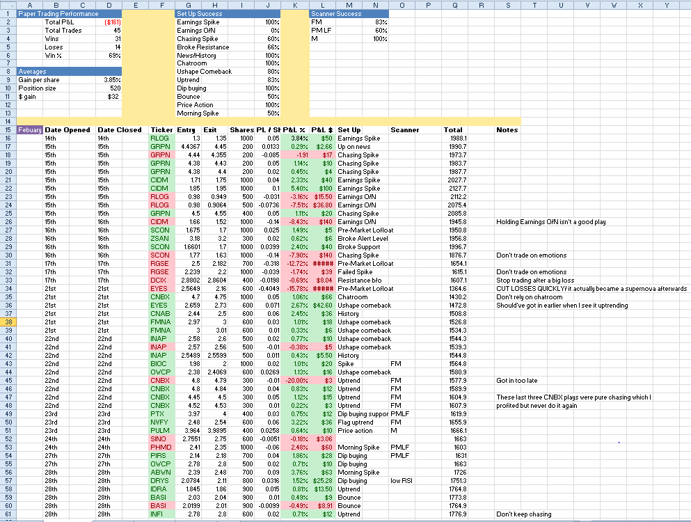 (Feb)- I developed my own scanners and solely rely on those for my set ups of the day. I only use the chatroom to see if I'm on the right track. I started to figure out which scanners and set ups work best for me and their success rate. Overtraded a lot and get out usually in less than 30 seconds after taking about 0.01-0.05 cents/share. I started February with $2000 and ended it $1776.9 and a winning rate of 69%. Also used a guide for position size:
