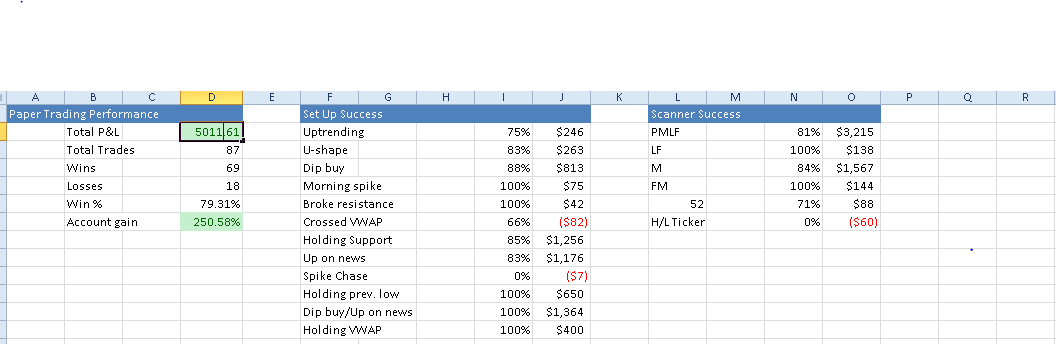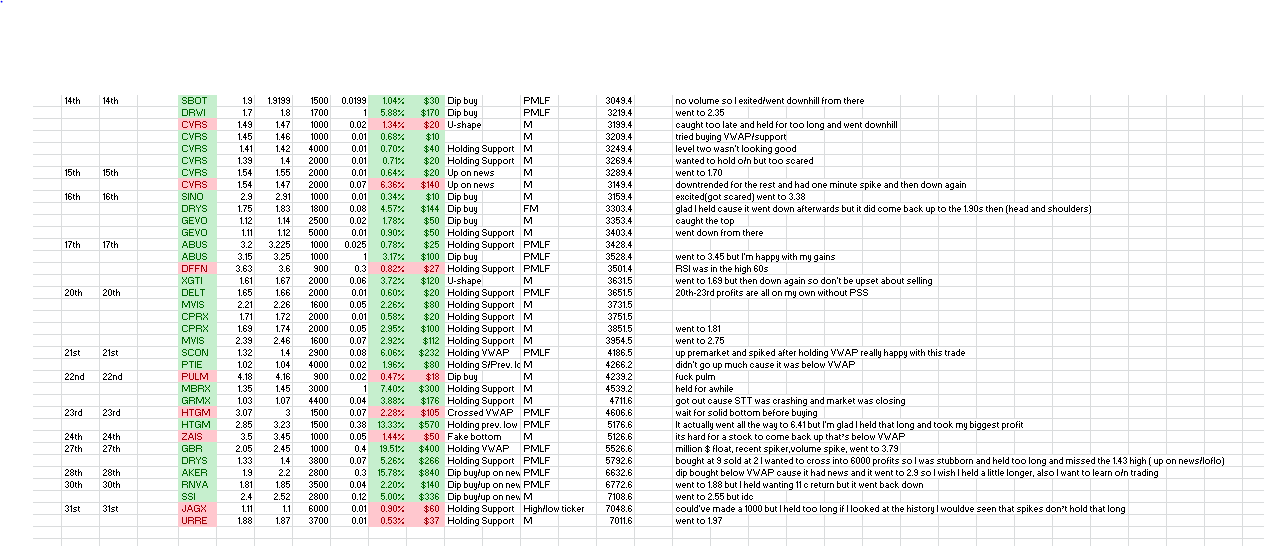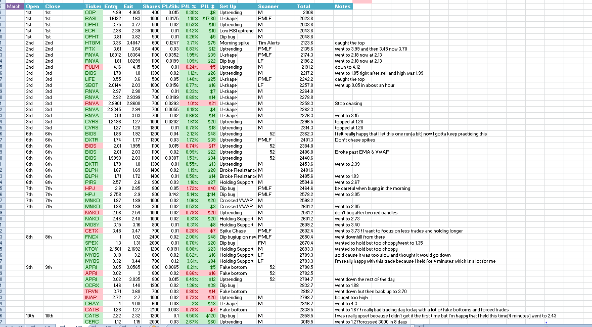 I've been paper trading for a little over 2 months now and my win percentage has gone up from the 60s to the 80s. At the end of February I said I wanted to focus all of March on trading less and holding longer on my traders and focusing on good set ups. I sort of failed at the trading less part lol but I am learning on entering the right stocks at the right time and learning to hold. I still get out too quickly sometimes cause I'm scared but for the most part I'm better and you can see all of my trades on this and the previous blog post. I'm aware that trading with real money won't be as easy as with paper trading. I have to worry about the PDT rule, execution timing, emotions, etc. But I've been tracking every single trade and I now know which set ups work and how often they work, I know which scanners to use and their success rate and how much each different variable has made me. I feel like I must be doing something right but all these numbers don't mean anything unless I start applying in real life. So starting tomorrow, I will officially start trading as of April-3-2017. I strive to make at least $300. I will not stop analyzing and studying from my past. I'm not saying I'm going to make it big or be the next millionaire or anything but I feel like this month is going to be big for me. I hope whoever is reading this also does well this month. Good luck to myself and to all of you. This isn't trader vs. trader, we're all in this together and I want to see all of you succeed. Thanks for reading and have fun ;)