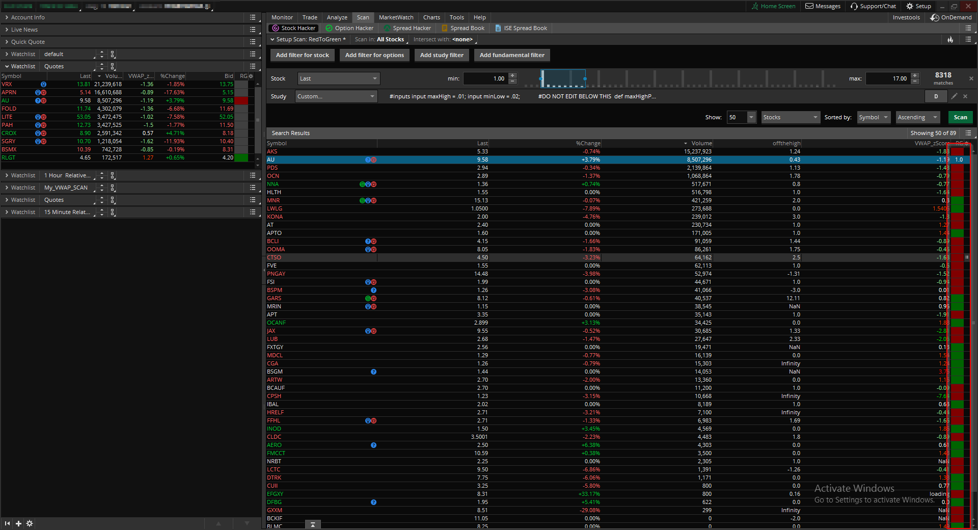 I made another custom scanner for think or swim to help you locate stocks that went Green to Red or red to green!