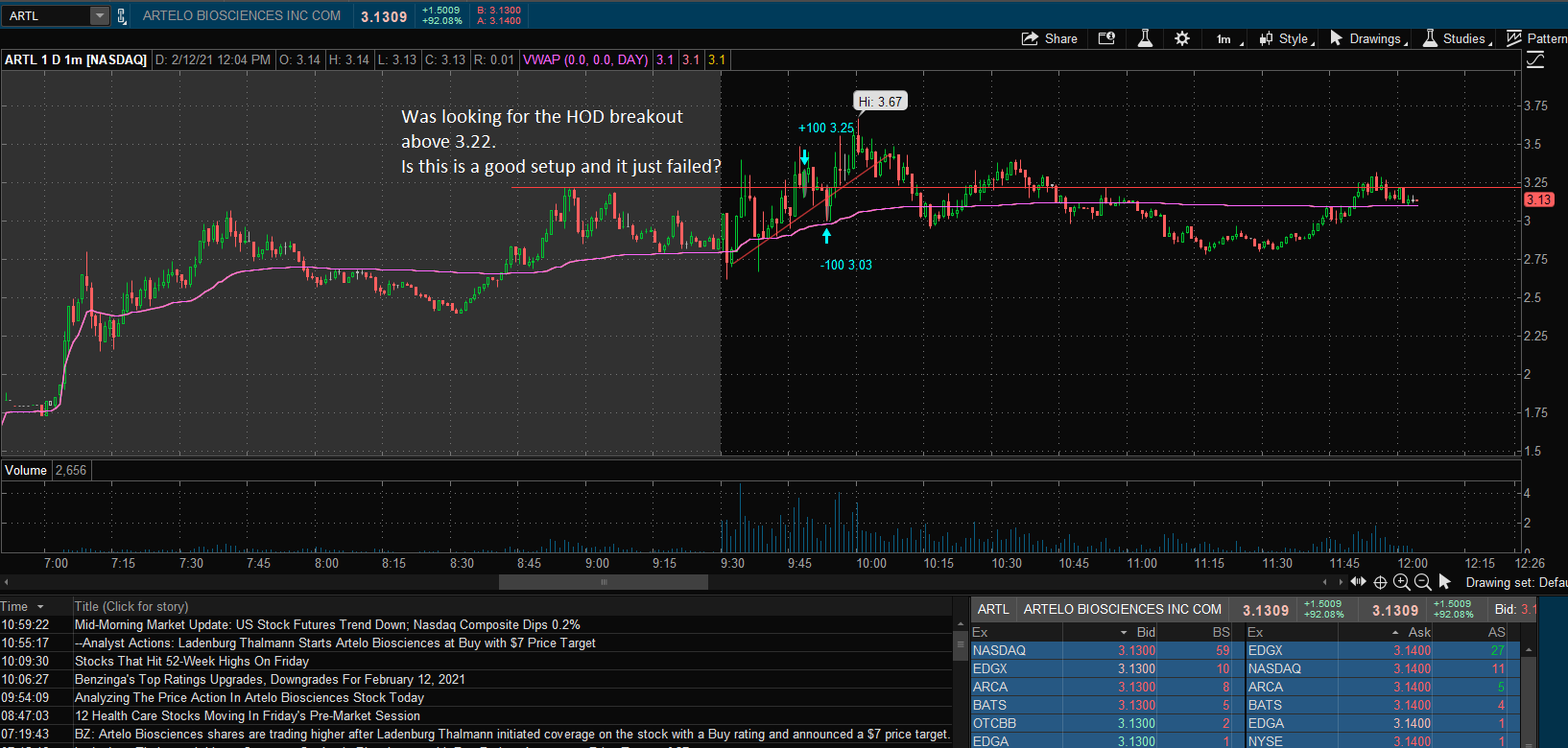 Hey man, I won't tell you if you are right or wrong as there are many ways to trade stocks.. For me I think this is not an ideal trade because of the rangy candles. The 1m candles in the morning have a range of 20 to 30 cents.. even 40 cents range in some cases. That's difficult cos its too hard to size up and manage risk so I wouldn't go long unless I was totally convinced this would run multiple days. I was more short biased on this but later learned about 'endocannabinoid' research it is doin
