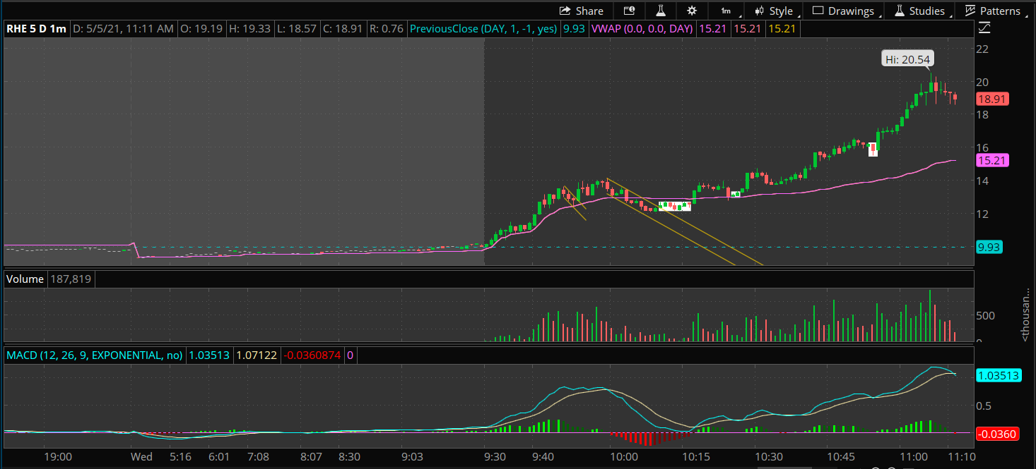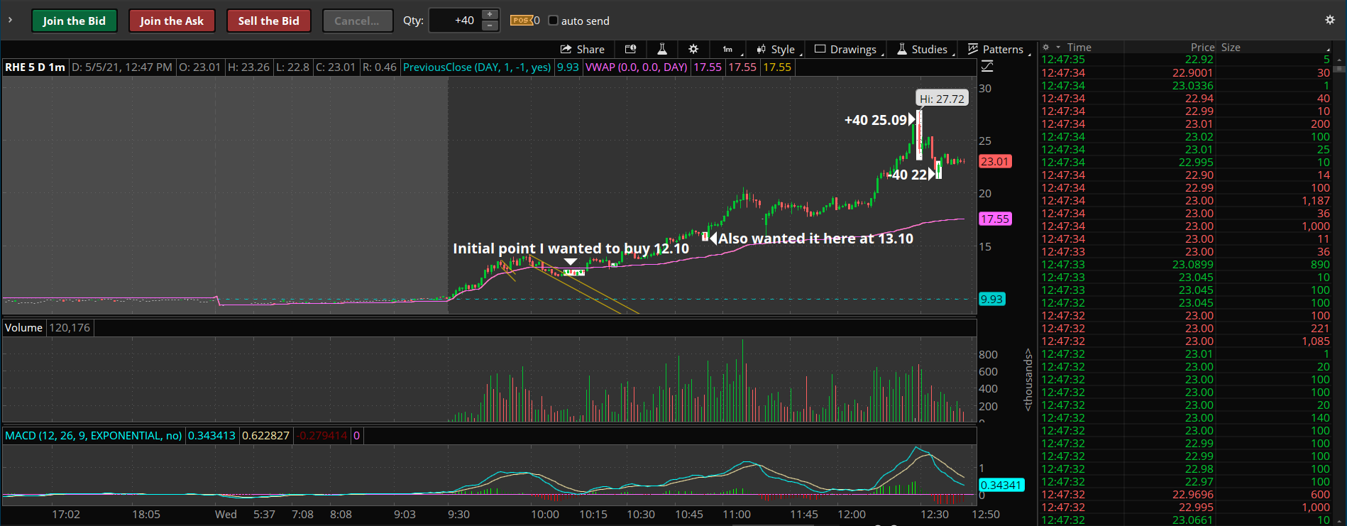 Made a great trade on $RHE monday. Then saw it up again this am so I had it on watch. Had 2 spots where I felt like I wanted to enter. those 2 spots were 12.10 and then when it popped the pullback in the low 13's. I decided against both trades because of the self talk in my head saying "what if i'm wrong?" Which is a stupid question to ask myself because I'm very good at cutting my losses. I even thought about buying in at 15.50 on the big drop but I told myself not to chase so I didn't take that either. I just don't believe in myself enough to commit and it's hurting my soul.... I'm really struggling with the negative self talk in the moment and I'm not really sure how I fix this. I talk myself out of some really good trades and some really bad ones too at times. My entries and my negative self talk have to be the #1 priority right now for me to become consistently profitable. I guess the only POSITIVE thing I can take away from today is that I was patient and didn't take any stupid trades or chase anything. So progress there even though I missed a gimmi setup lol.