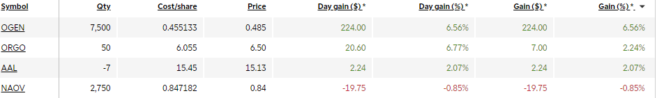 December 22nd Holding Holding overnight: 2750 NAOV @ .85c 2500 EVFM (sold shares own calls) -7 AAL plus 2x 1/15/21 $14 P 7500 OGEN at .4511 (unfilled 10k order) 50 ORGO @ 6.05 (looking for that ridiculous gap fill at $135 laugh at me now) Posted Dec 23, 20 12:04 AMbyGotSeoulTickers OGEN, EVFM, AAL, NAOV, ORGOViews 63 / 0Received 0 KarmaJoin now or log in to leave a comment
