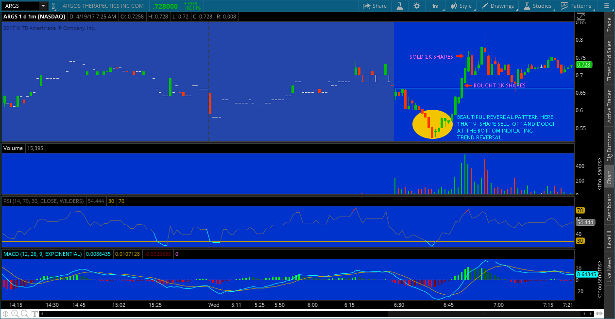 Todays trade on ARGS had a beautiful REVERSAL PATTERN to it, aslo RED 2 GREEN move. I should've loaded up on SHARES but I hesitated, as I usually and am only comfortable trading with 1k Shares at a time. The better entry on this trade would've been the .55 mark, which was the green candle to make a new high, instead I played the break of the open and sold close to pre-market highs, I was planning to ride it to the $1 mark, but the upper shadows on the candles realy convinced me to get out, and good thing I did, I came away with little profit, not companing, I'm grateful.