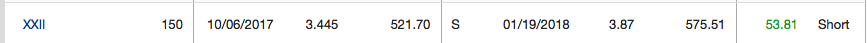 In October XXII was spiking in the morning. I decided to buy in. Of course I made the mistake of not paying enough attention to when I got in. Price action had turned on me for a fake out break out. A marijuana stock with a good product I had no reason to give this stock up because I knew it would come back. Yeah it came back recently January 17th it started to slowly climb from Marijuana news. The next few days it broke $4 a share level. Of course I wanted to get a good profit so I continued to hold, before it dropped again. Believe me this is a slow moving stock and it wasn’t going anywhere no matter how long I waited. So Friday the 19th in the afternoon I decided I waited long enough I need to get a profit out of this and sold my shares at $3.87 and made $53.