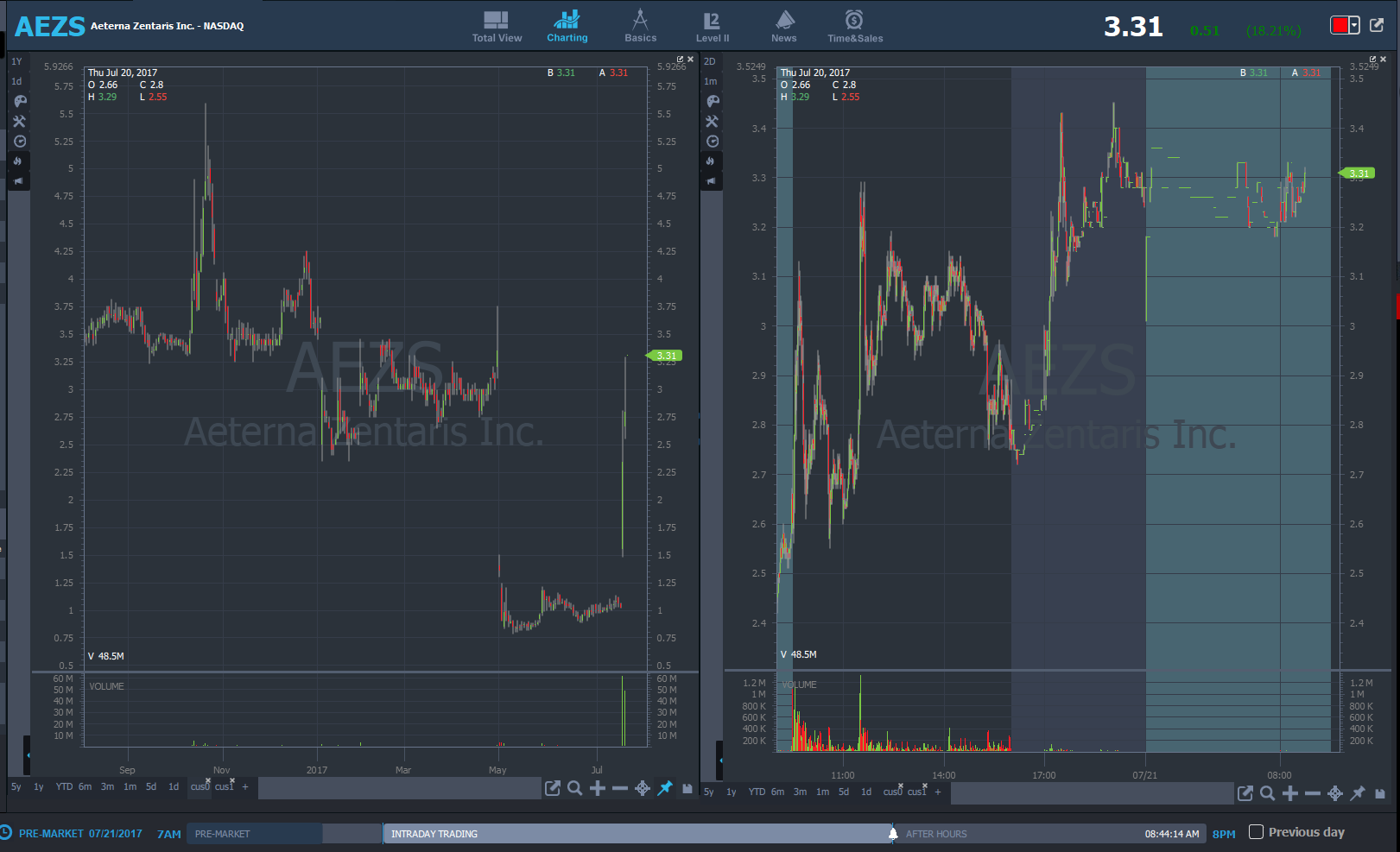 AEZS 7:53 AM - way too overextended for a long and no borrows at IB so just watching and learning, could have a weak open red/green and spike but too risky imo