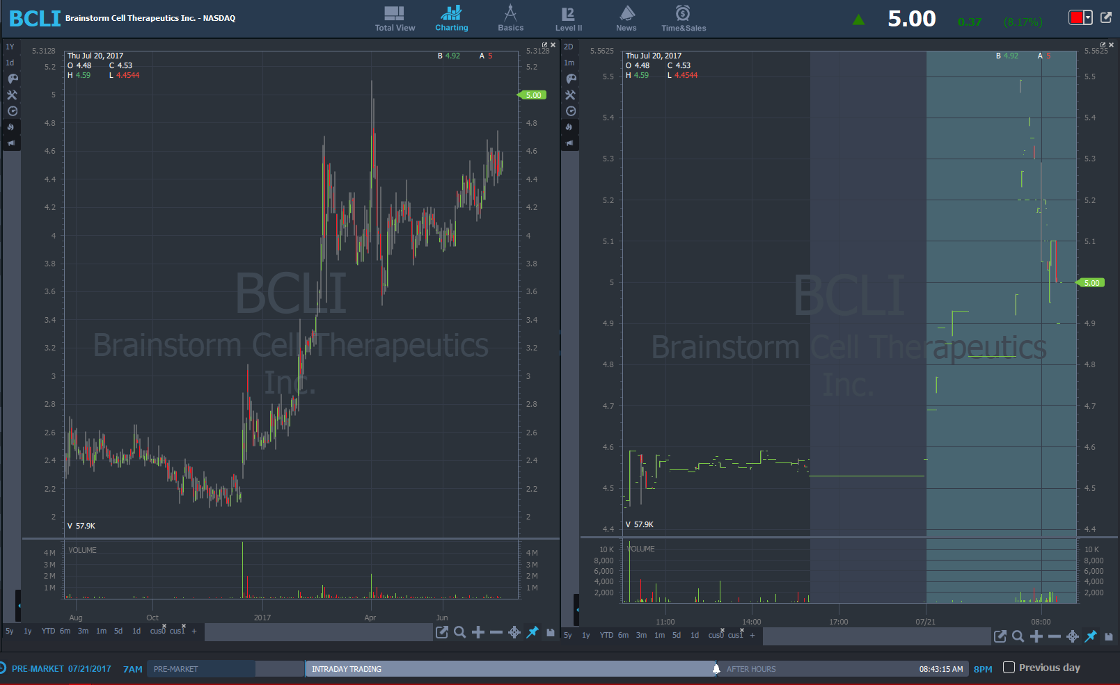 BCLI 7:53 AM - broke 52wk high at 5.10, could get running as long as that level holds, float 16.8 mill, either sell half by 5.43 or sell all