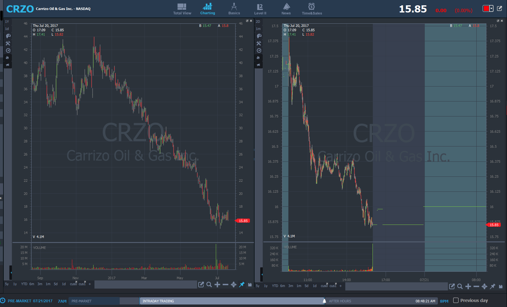 CRZO 7:57 AM - 30 minute opening range, this followed the 30 min range pattern many times and tends to continue in the direction it breaks till eod