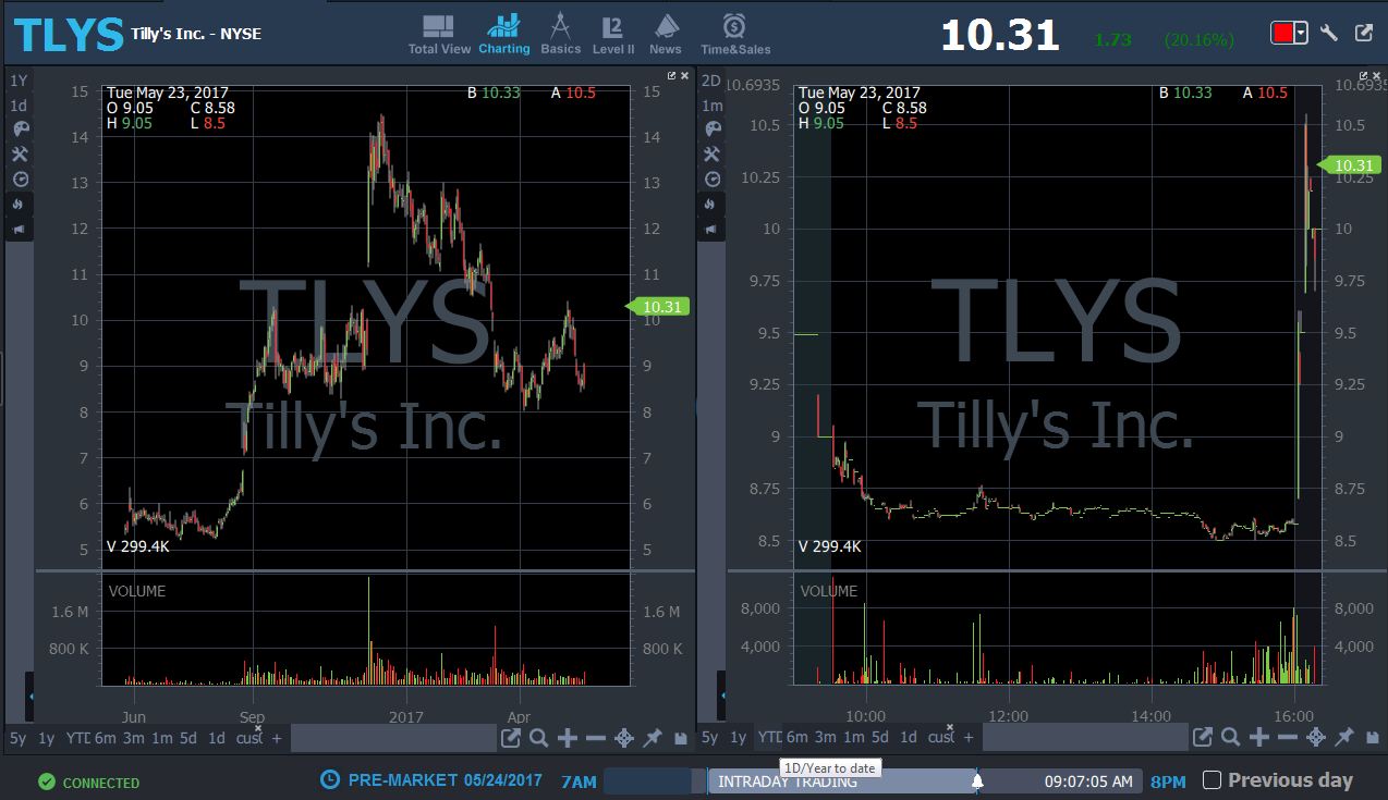 TLYS 8:19 AM - earnings winner watching 10.50 level for potential long