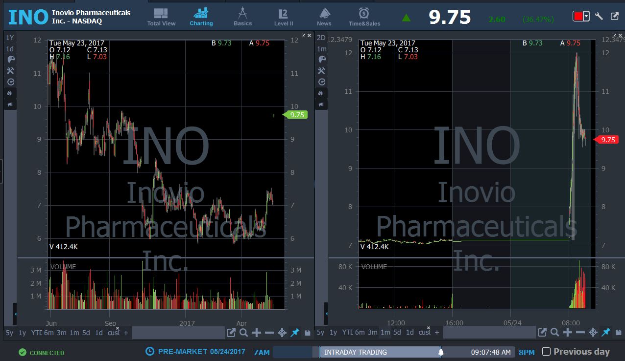 INO 8:43 AM - positive drug news, looking for panic in pre or panic out of the gate for a potential dip buy, had a big move in pre which is most likely not sustainable