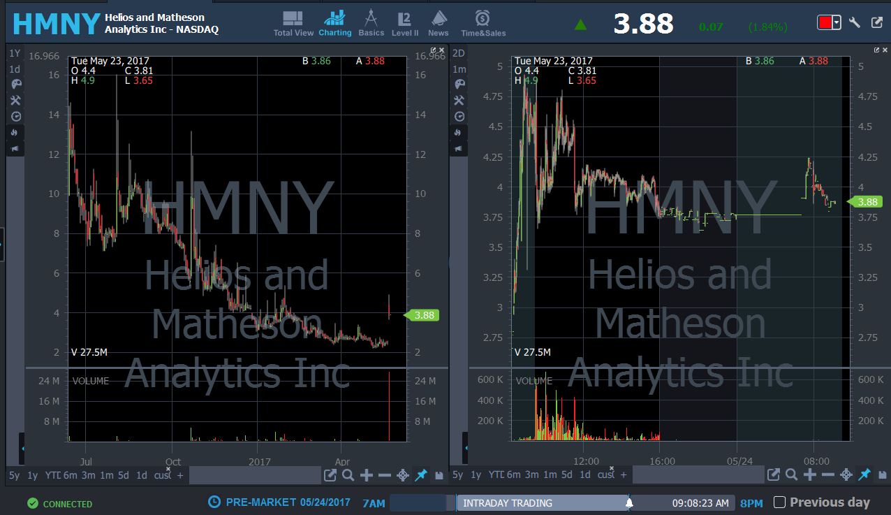 HMNY 8:01 AM -on watch for potential short into $5 resistance risking that level on the longterm chart, if breaks 5 cut losses and reshort into 5.50 resistance risking that level