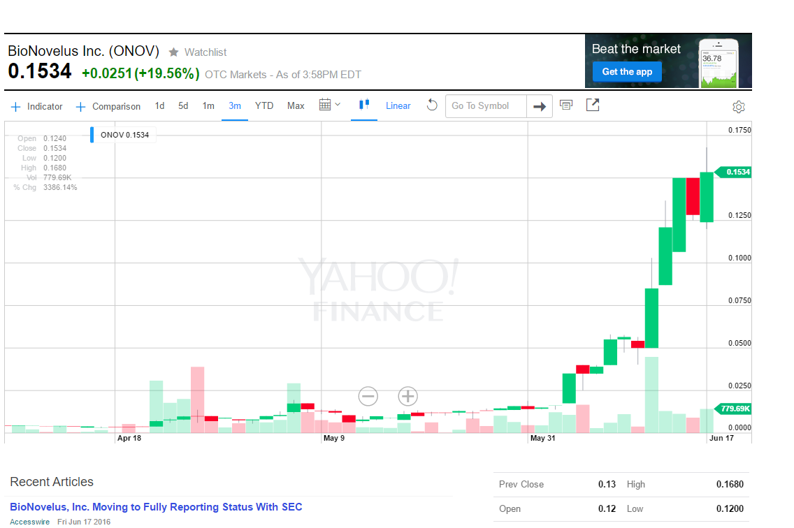 I found this on otcmarkets.com while scanning for percent gainers and ignoring anything without a decent amount of $ volume, around 100k is good for penny stocks. (This is not shares volume but $ volume. Shares x price, I scan for that because it's easier than specifying a minimum of say a million shares, then finding stocks with a million volume but a price of $.0001. This way scanning is easier.