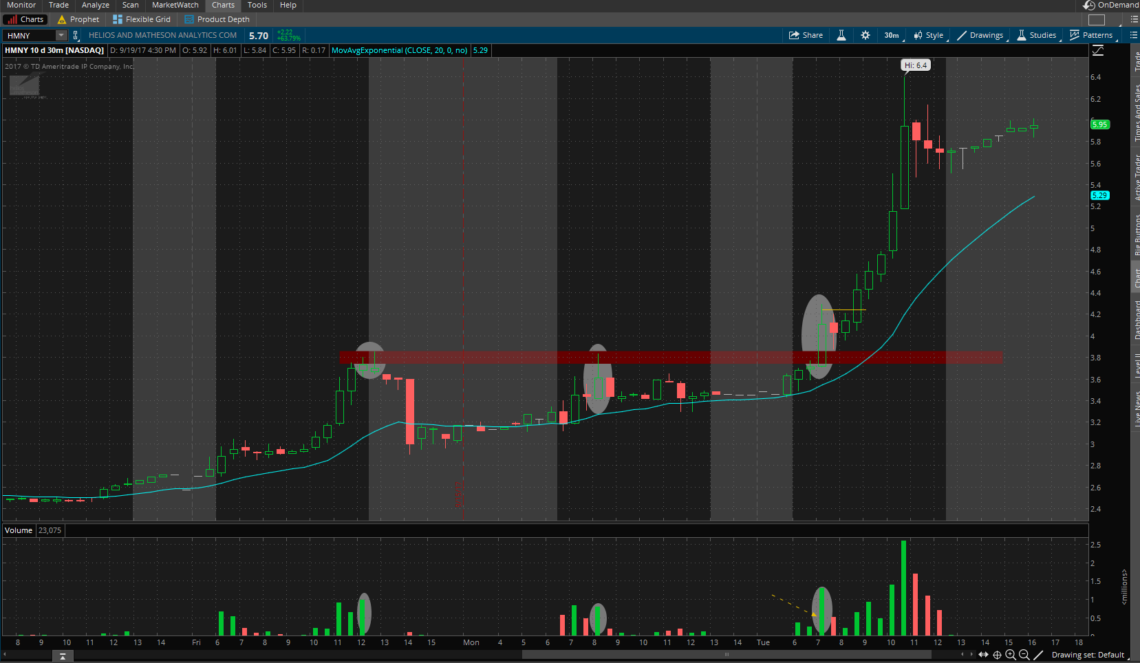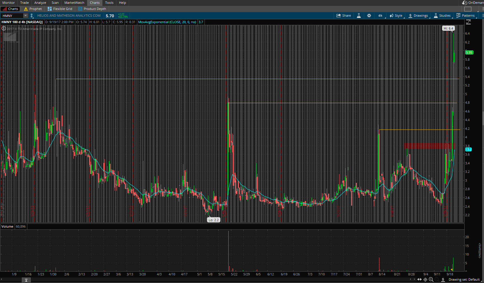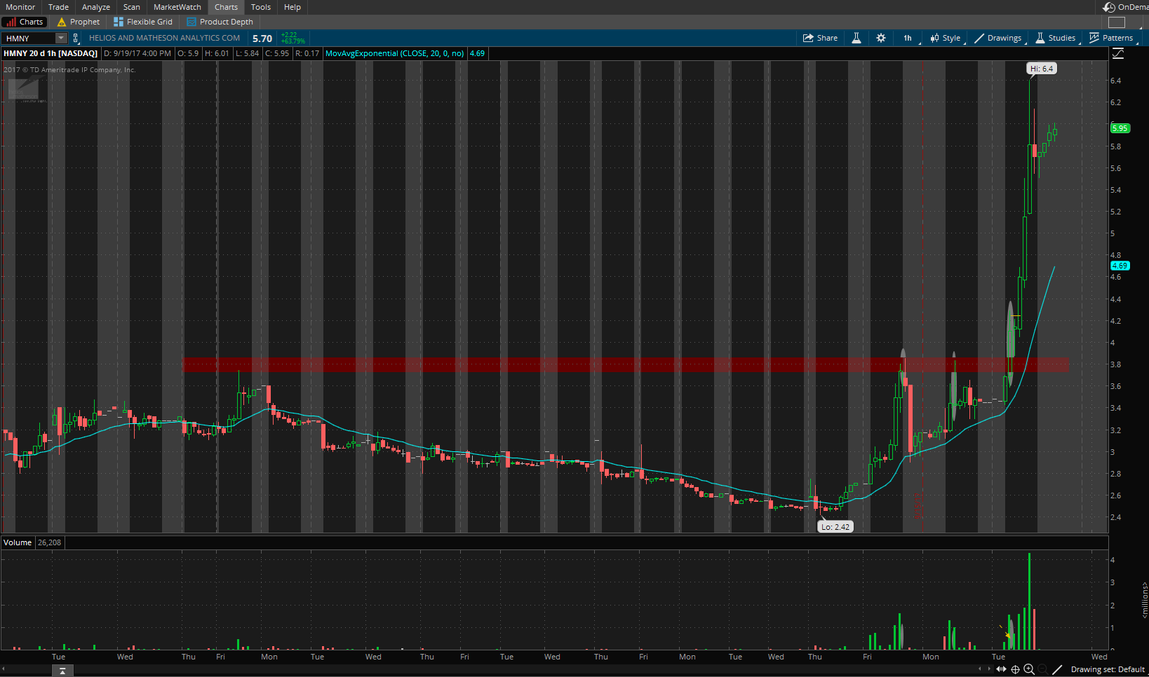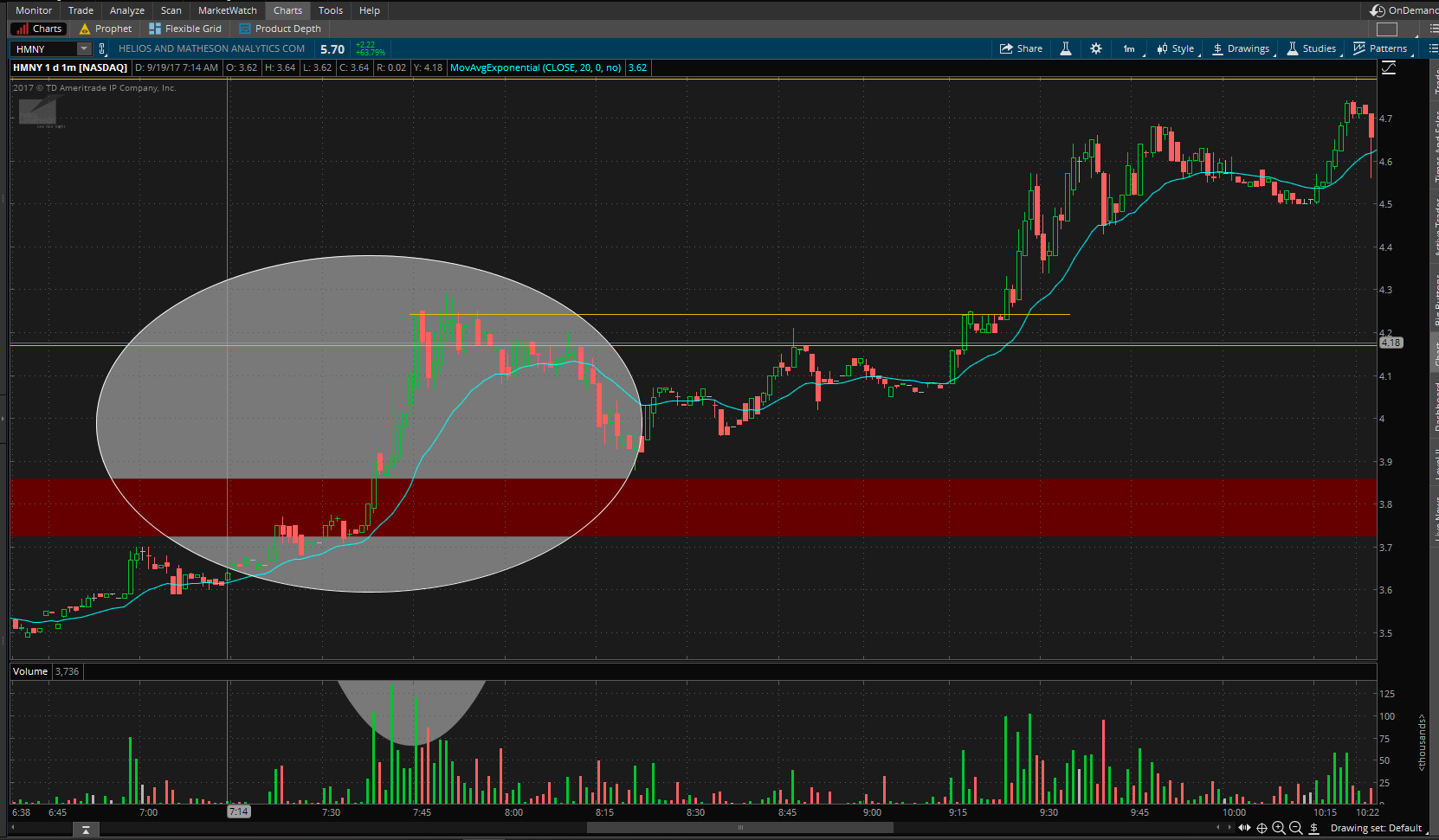 Noticed HMNY on general trade alert for potential dip buy. Didn't exhibit the behavior pre-reqs, BUT there was a breakout of a strong resistance level at 3.84 ( 30min chart).
