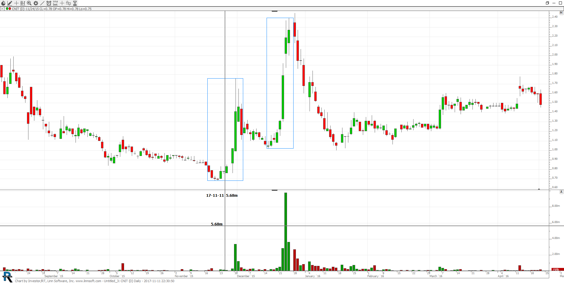 2) spikes mentioned in #1 had no catalyst, and appears to be pure low-float pump plays ( maybe something to do with a delisting notice in mid-late Nov 2015.)