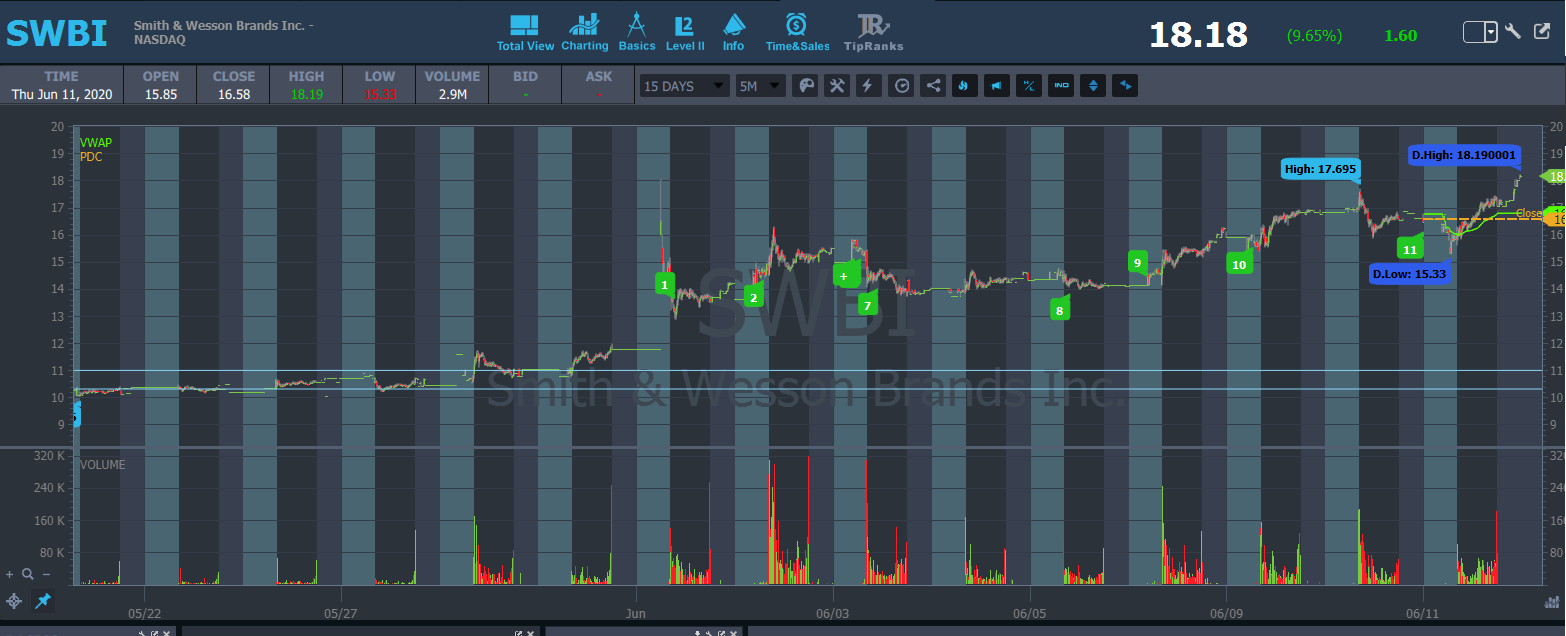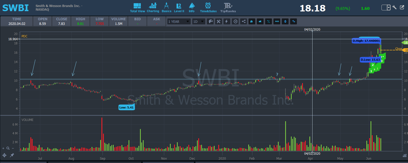 Tim, I've been putting some hard hours studying and preparing for this journey and I would like to have your input about whether or not I'm on the right track here. Through the scans I created in STT I found SWBI and got interested because of the spike in the last 7-10 days. I took two screenshots, one showing resistance in the daily chart(5 instances failing to break $10.5) and another showing the breakout on 6/1 followed by a massive dip and gradually coming back up to the the 6/1 high of $18. I figured the civil unrest was the catalyst for the breakout, is my analysis off base or am I in the right track? Thanks in advance for your time and dedication to show us the right way !