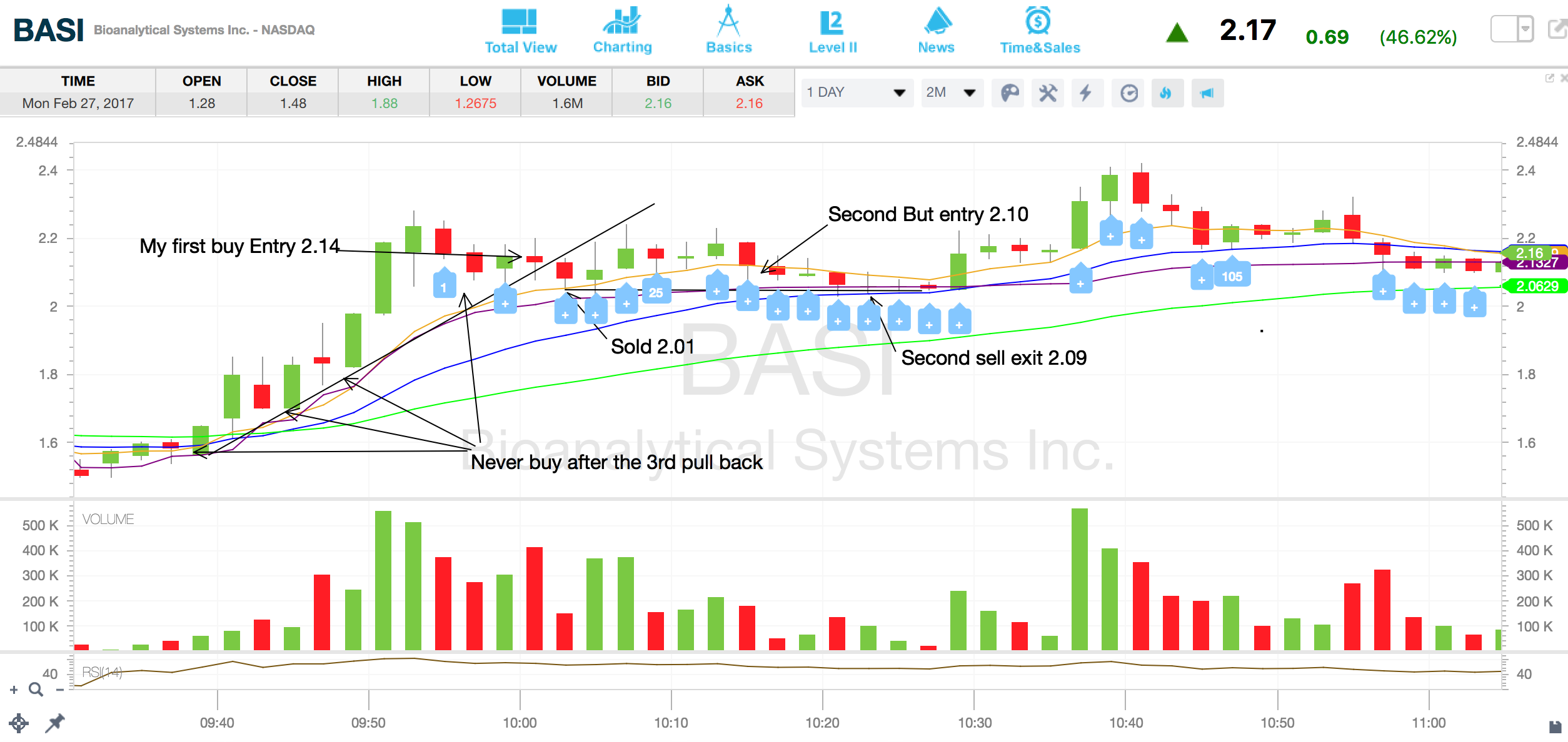 My second entry was just plain dumb. Buying when there's no strength, no trend, no real area of support. Then selling just 4 minutes before it breaks and makes a NOD at 2.42.
