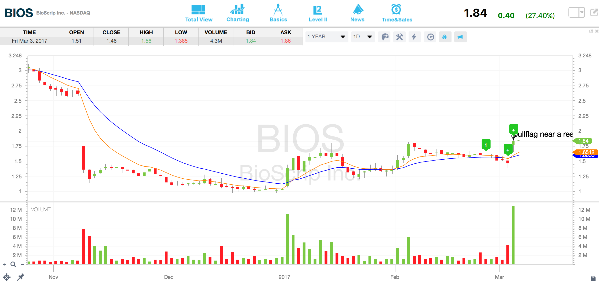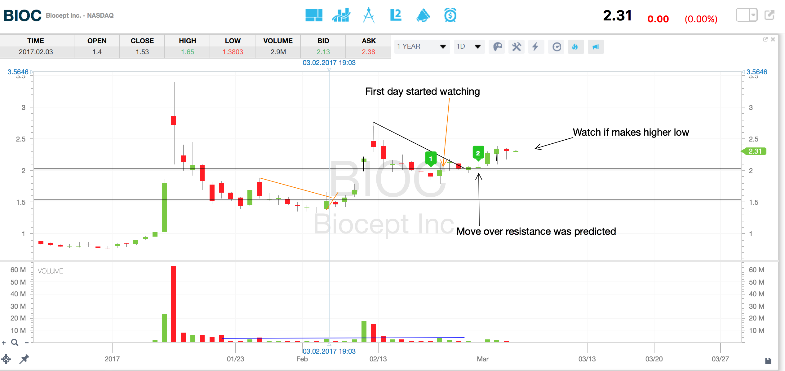 BIOC - I first seen this on Feb 22. When it closed near multi month resistance area from June 2016. It did have a bit of a retracement over the next 3 days and finding support from the past resistance at 2 and then continued to grind up on low volume. Prime example why you nee to keep this on watch for a few day.