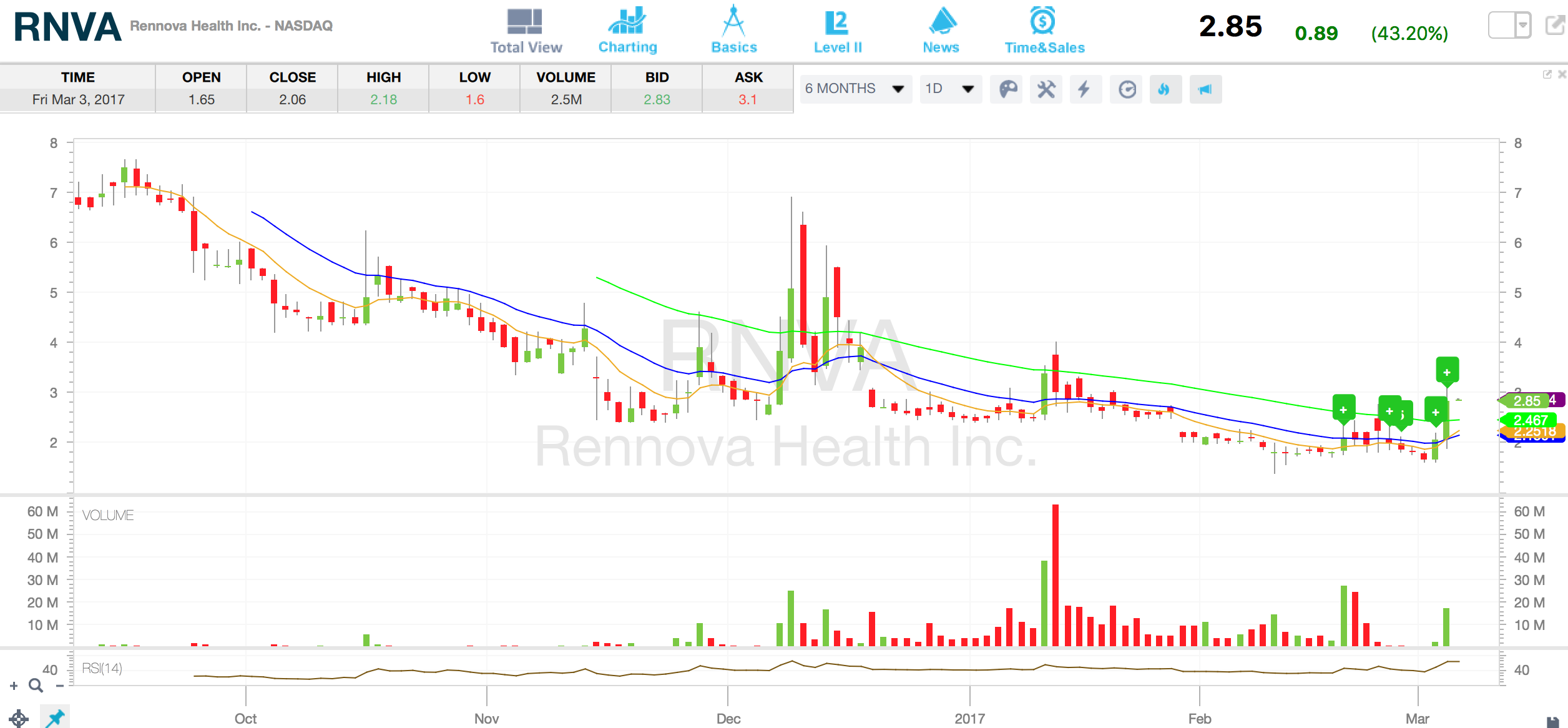 RNVA - Not sure what it could do Monday. Potential trade with heavy volume and a break over 3. The chart Reminds of ETRM before it ran from 4 to 25$ over three days