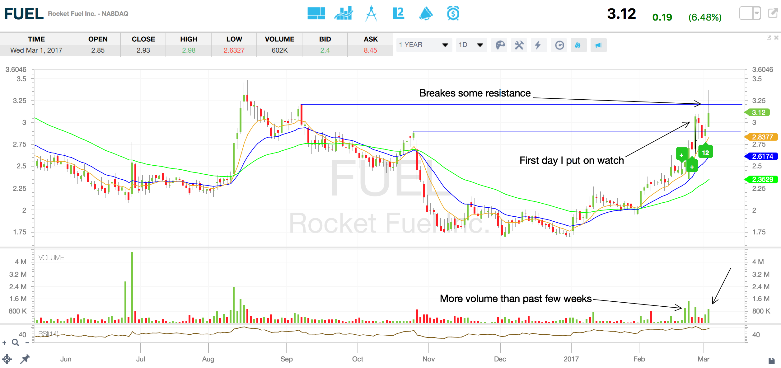 Fuel - First notice this on FEB 24th when it had its big recent Green Day, trading from 2.64-309. Next two days it went red and found support today trading from 2.94-307 and closing at 3.12. Wish I had been watching this today and not the other junk. Ill use 3.09 as support and look to trade Friday.