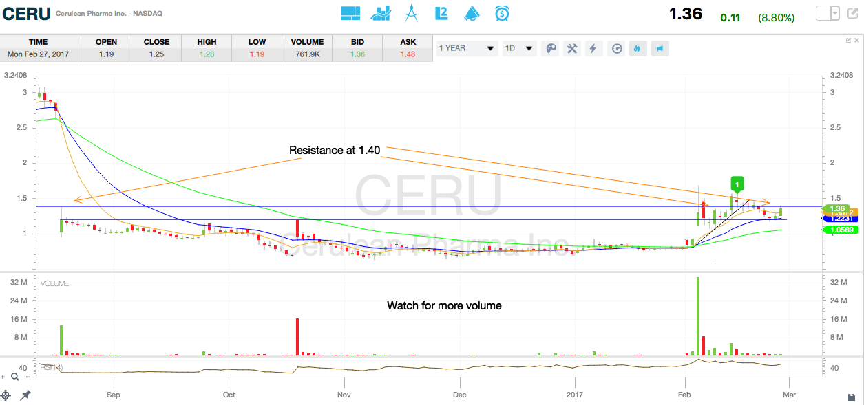 CERU - Watching to break past 1.40. Resistance and a previous high 3 times now in the past 6 months. If it can break past $1.40 and hold support over that, it'll have room to trade till $2.00 - $2.10 Id sure like to see more volume push it up. Notice it has traded past $1.04 seven days this month but hasn't been able to hold it Gains and stay above. It'll either crash or breakout. Can only go one way and the direction is soon to be determined. KEEP ON WATCH
