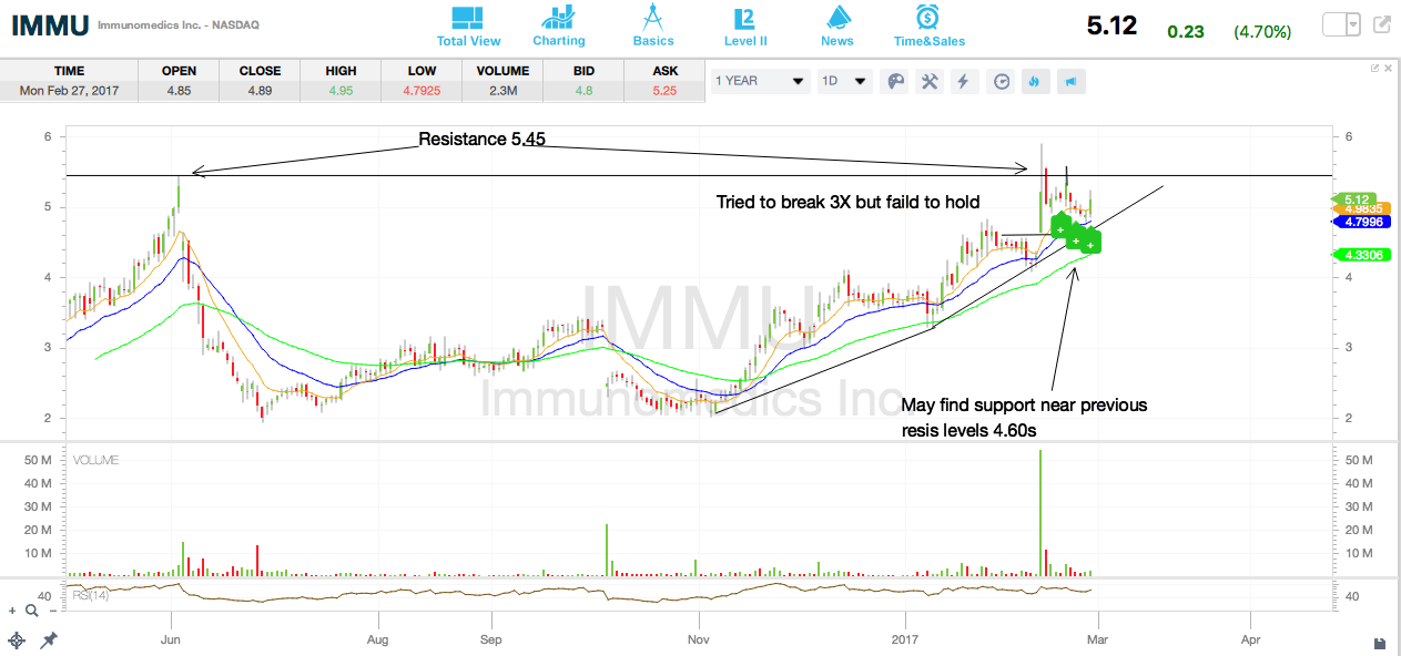 IMMU - Big green day for it today. Like I said yesterday, it has failed to hold over 5.45 twice in the past few days so that is my key level for a breakout and the only time ill make a trade. Like to see it ride the trend its forming on the 6 month chart starting from November. Also, looks to be tightening up on the 6 month chart. Seems to be Bullish...