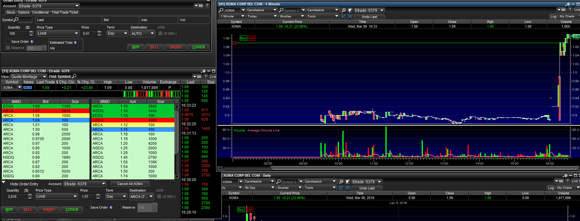 XOMA a/m weird price action If you look at the LV 2 prints you will see something odd.. Posted Mar 10, 16 6:36 AMbyJesusLovesUCategories Price Action: Level 2Views 206 / 1Received 1 Karmajdough2315 Mar 10, 16 8:18 AMare you talking about the super low bid size and the crazy high ask size(s)?JesusLovesU Mar 10, 16 10:26 AMNope.. When you look at the prints you see a .8878 for 2013 shares. Right before and after a 1.08 print.JesusLovesU Mar 10, 16 10:27 AM@jdough2315 Join now or log in to leave a comment
