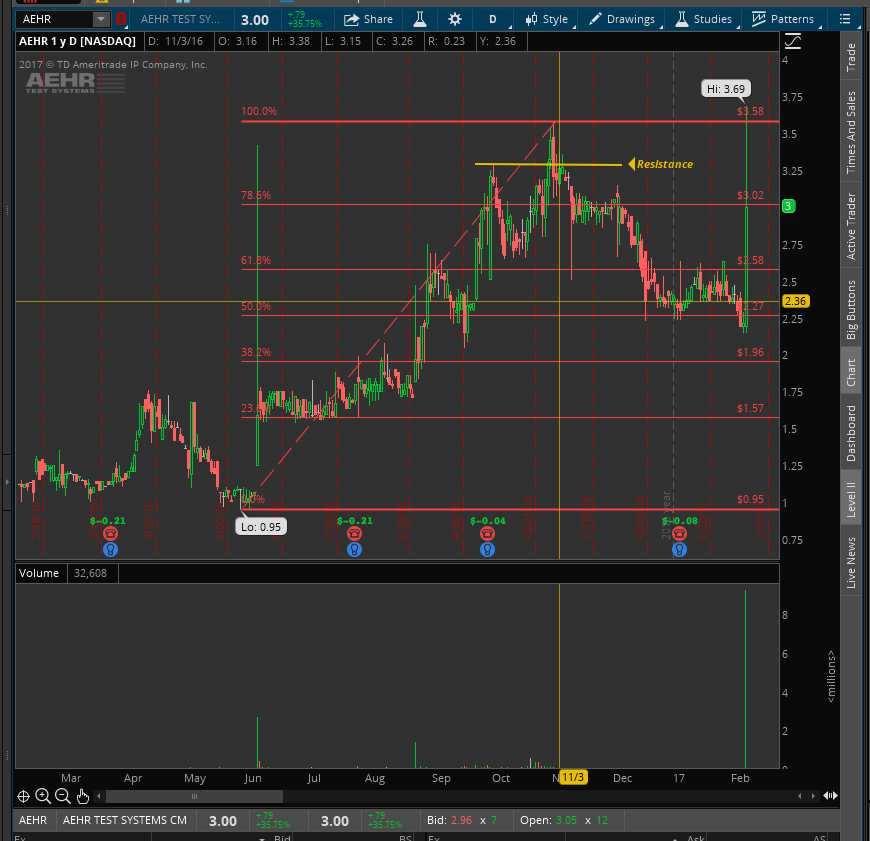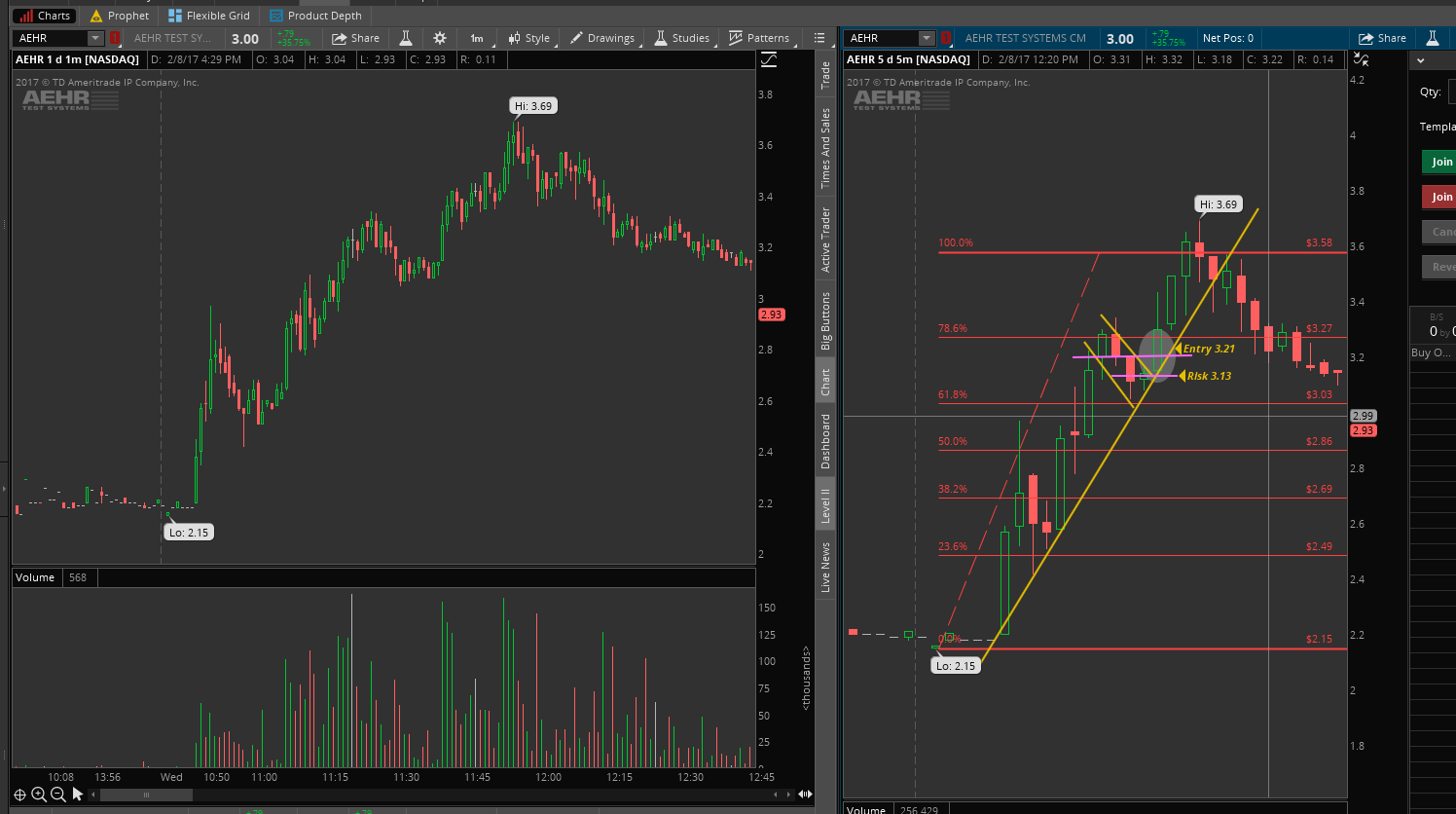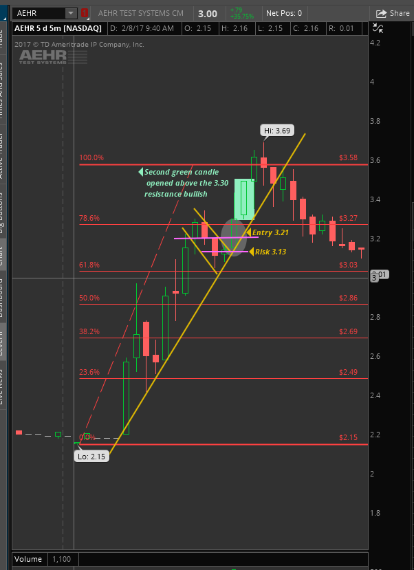 $AEHR didn't play but low float runner with major volume spike. Would have bought the flag pull back on the 5min chart around 11:20-11:40. Would of entered the flag when a candle broke a high over the previous red candle at 3.20. my entry would of been 3.21 with a tight stop. If the flag failed I would off instantly sold for a small loss. With momentum hoping to break the 3.30 resistance goal to sell at 3.50-60. Small position considering how much the stock already ran today. The higher the stock runs when you enter the smaller position you should consider taking.