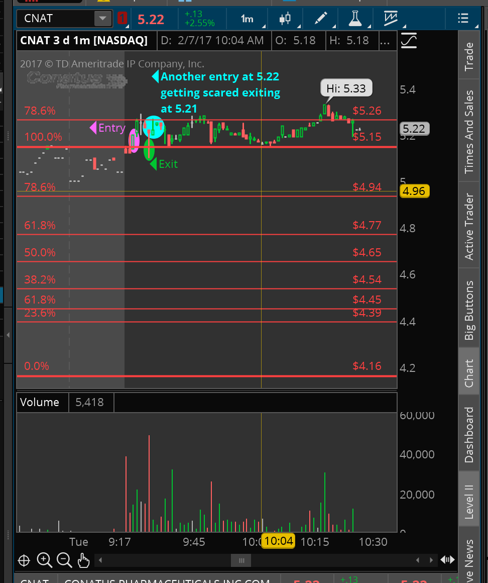 $CNAT Entered this trade twice when the market opened on the break of Pre market highs of $5.15 as you can se in the picture below my entry & exits I took a small position cause I know my biggest issue is staying in the trade I do cut loses quickly but maybe too quickly. I used 5.10-15 as my risk with a goal of 25-50c per share not sure if this was just a bad trade or just a failed spike? Advice would be helpful. I as of what I'm looking at now at 11:00am the stock b/o failed. I do think it did have potential but me re entering was not smart. Revenge trade to make my small loss back ended up loosing again. I do have to have more patience. Comment below thanks!
