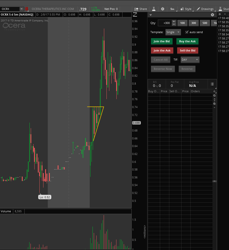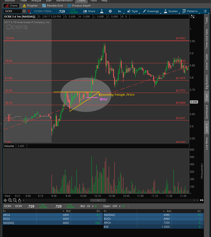 $OCRX had a major volume spike this morning. Didn't trade but came up on scanner, formed a ascending triangle between 9:40-10am. Resistance of the pattern couldn't b/o .74 for about a half hour then it finally hit .75 buy signal after consolidation voluming spiking reaching .95 resistance where you would look for it to b/o the whole $1.