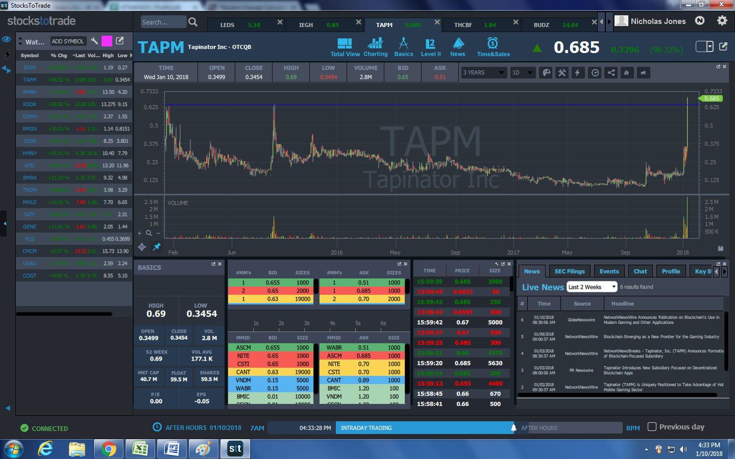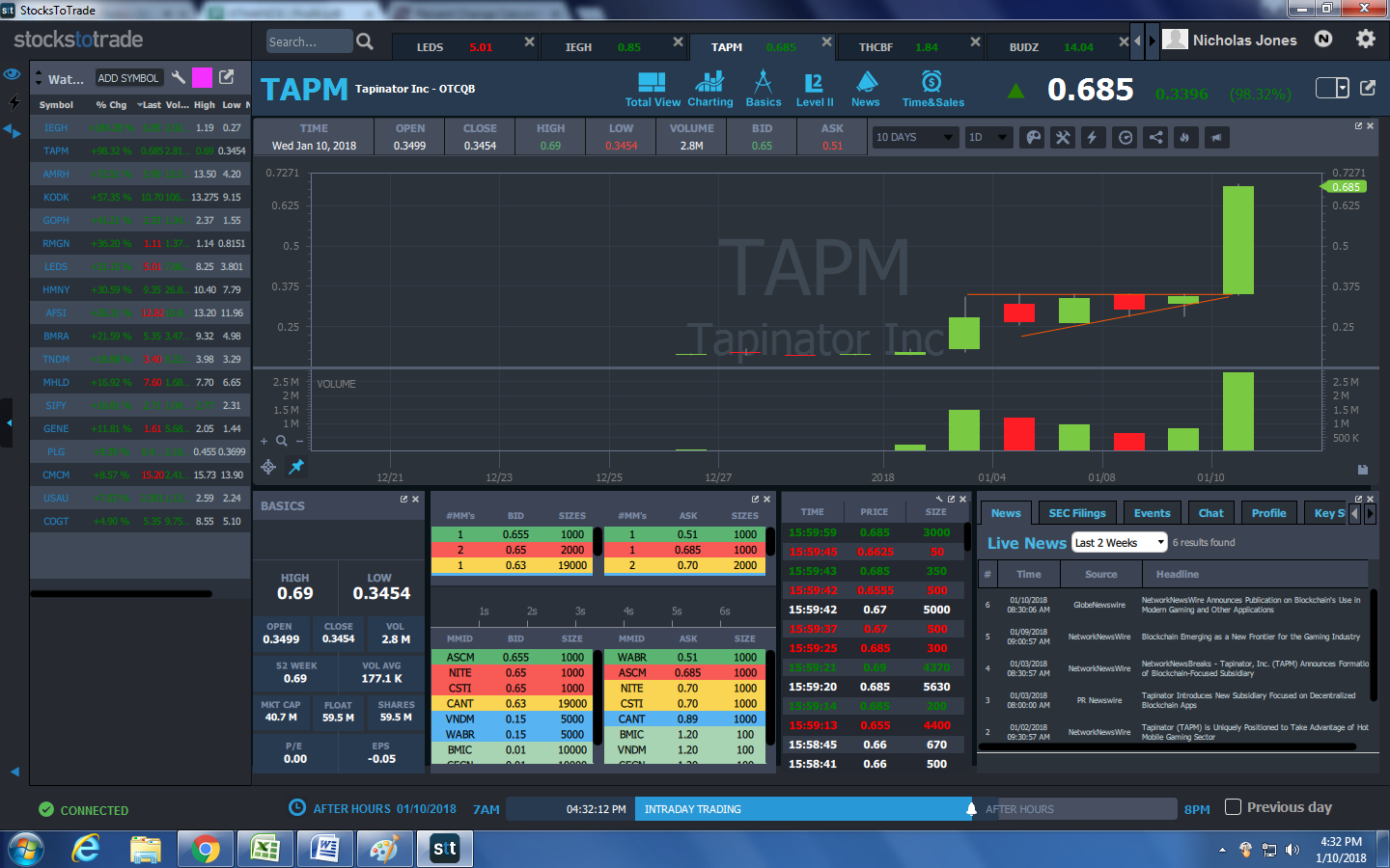Hey guys I wanted to talk about this set up. So imp seeing $TAPM started making an ascending triangle on the daily, and broke out. I was watching in the .50s when it was choppy wanting to risk off a higher low off up from .42, but it was lacking volume so I was looking at something else, I came back after its afternoon spike up saw that it had broke its 3 year high at .64ish, and got in on a dip when it held about the previous HOD, I’m in very small size since its much greater risk. Anyways I think it could be possible for a morning spike, it next over head resistance is about 2.00. What I don’t like about the trade is that my entry is up around 100% from its breakout at .35. I’m probably expecting too much too fast, but that’s what the small size is for :)