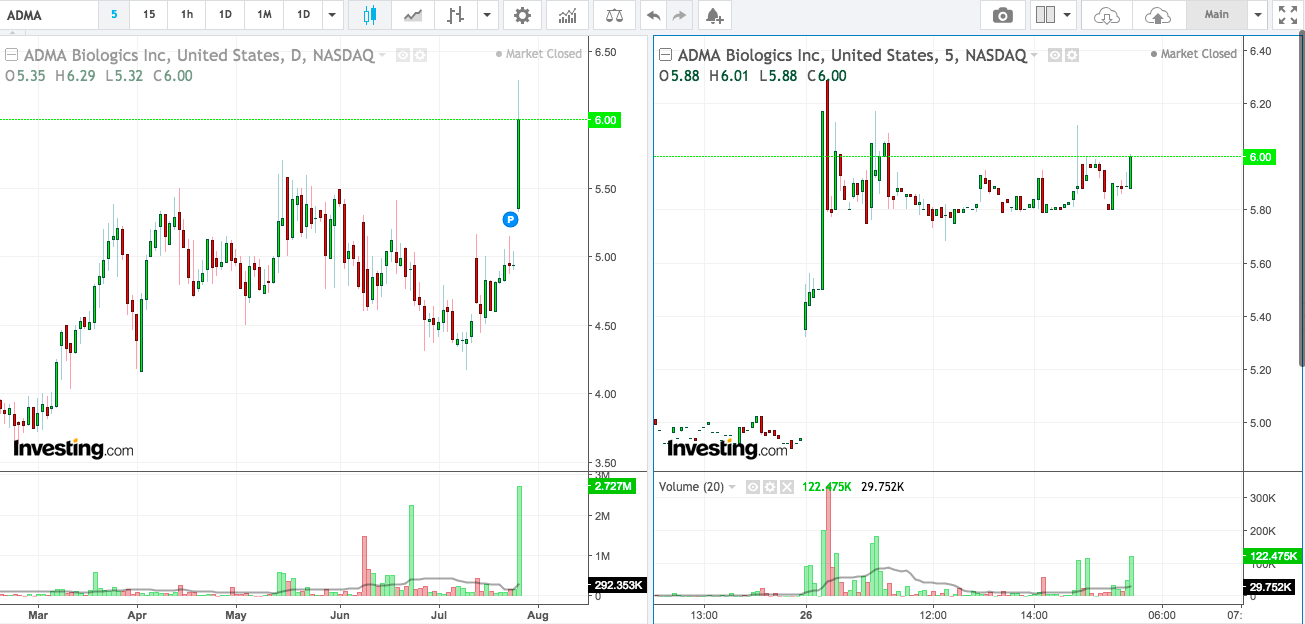 Just a quick analysis of my only trade today.. ADMA. I got in 300 shares at 5.85 in the last hour. Got out 5.91 for small profits but my plan was to hold overnight if it really ran into the close. It did run a little but I wanted to see a convincing break over 6 so got out.. played it maybe too safe but im starting with a small account so dont want to risk overnight holds just yet unless the stock does exactly as I want. I think this will break 6 as it has already after hours and should have a second green day but why do i think this is a decent trade? Its certainly not a perfect trade by all means as the catalyst isnt huge but taking into account the other factors combined this makes for a good play in my opinion.