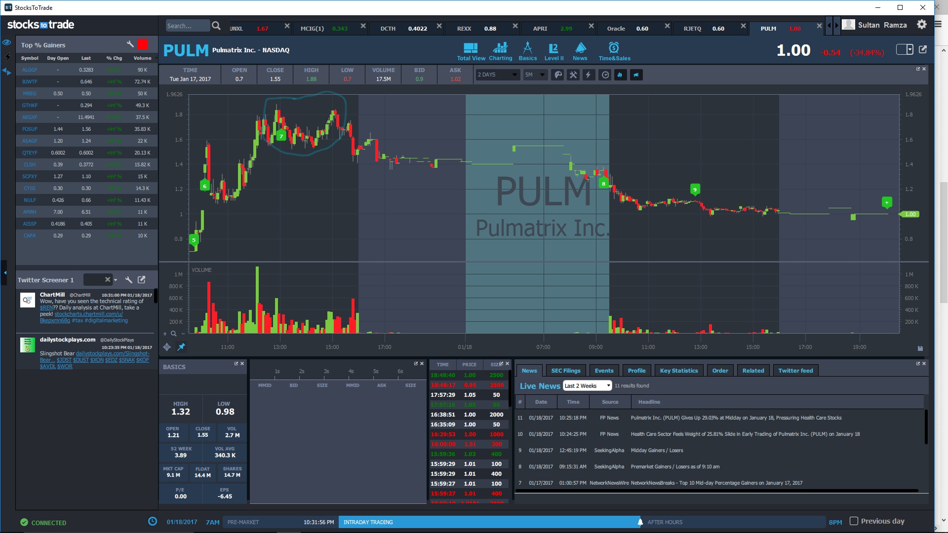 If you look at PULM's longterm chart, you see that it doesn't tend to hold its big gains AT ALL the next day. So it was on my watchlist but ended up crashing Day 2 like it had done many times in the past.