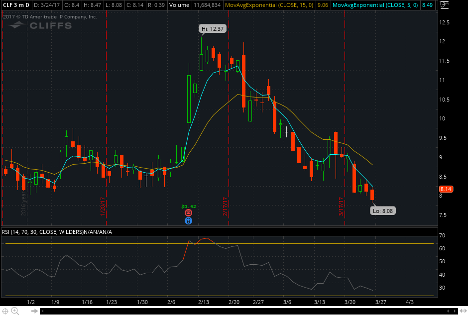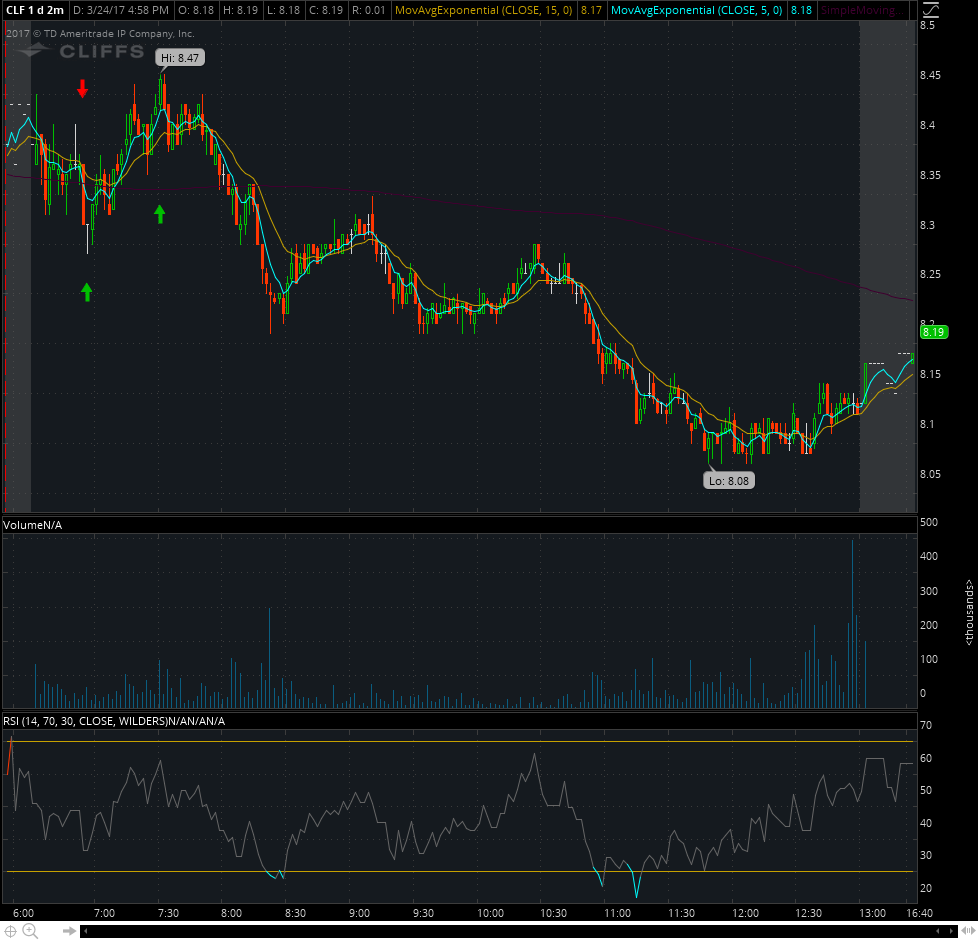 I shorted CLF off the HOD because this stock often has a quick morning high then trends down. On Friday, this had a morning high of 8.45, before failing twice right around 8.42.