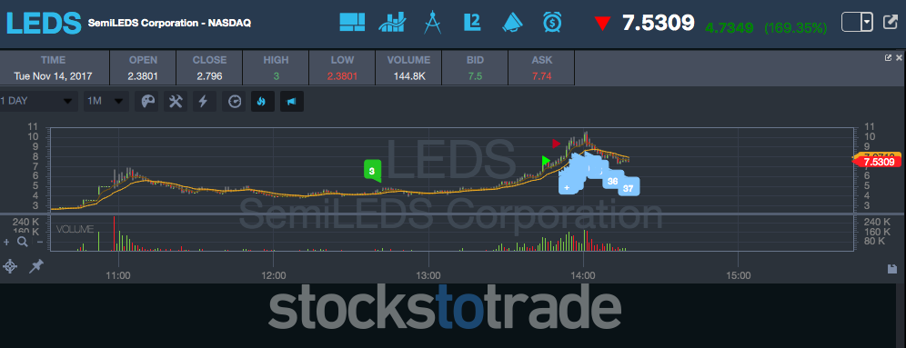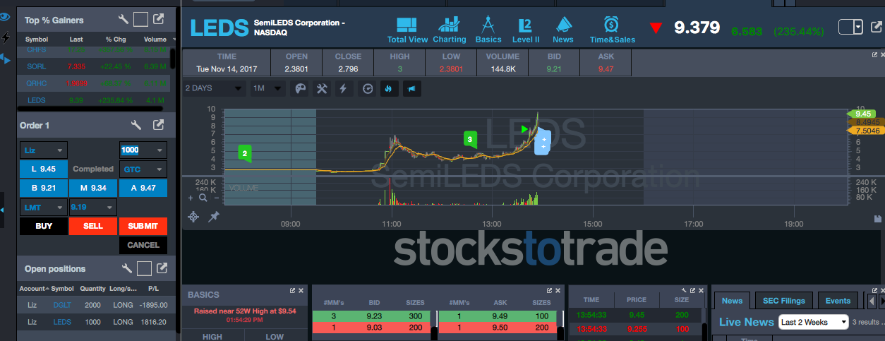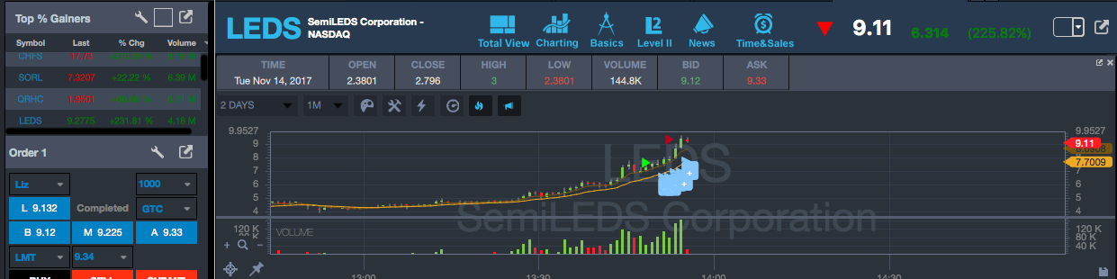 I watched $LEDS break out past $6.90. It came up as a big percent gainer on STT. Did a paper trade earlier and lost $100 on CHFS, had a small position of only 100 shares because it's pricey. The profit on LEDS was $1721. I wanted to jump in and buy ten shares in real life but i'm still kinda chicken, and after it got close to $10 it was trending down anyway so i'm glad I didn't. Second point of resistance for $LEDS was back in July when it hit $11. It did not break that previous top. Seems to me like every spike is slightly smaller than the last big one. Big runners today! In 1000 shares at $7.634 out 1000 shares at $9.355. Looking forward to my Market Mastery Class in NYC coming up soon! This one trade could have potentially cleaned up all of my smaller losses. Woohoo!
