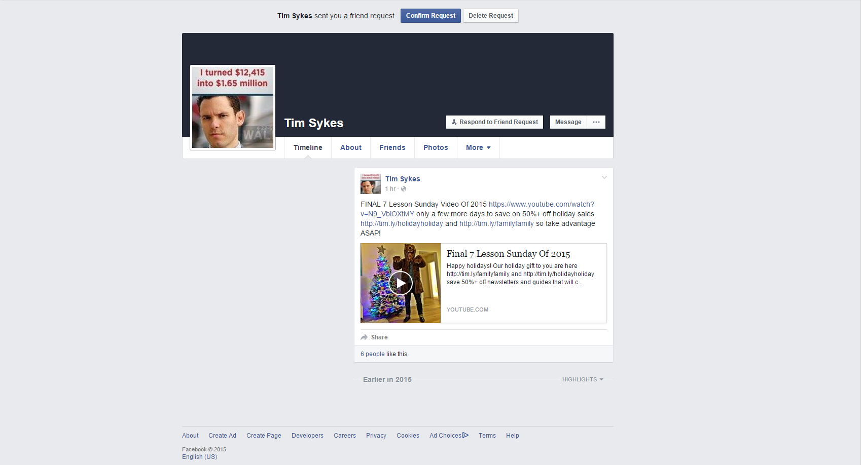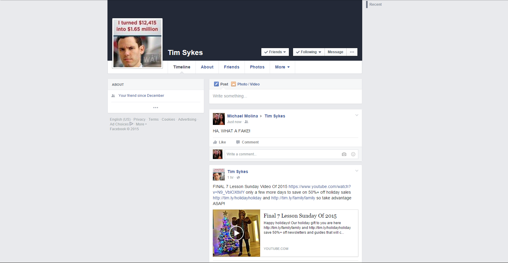 Timothy Sykes Wannabees Posted Dec 28, 15 12:56 AMbyMadMikeyViews 490 / 0Received 0 Karmatimothysykes Dec 28, 15 1:35 AMPleas post link so I can report the fake accountMadMikey Dec 28, 15 1:36 AMhttps://www.facebook.com/profile.php?id=100010898296850&sk=wallSpliff530 Dec 28, 15 8:28 AMhttps://www.facebook.com/profile.php?id=100010898296850&fref=tsKShim Dec 28, 15 12:16 PMsent me a request twice. Some people actually believe that's Tim :/Join now or log in to leave a comment