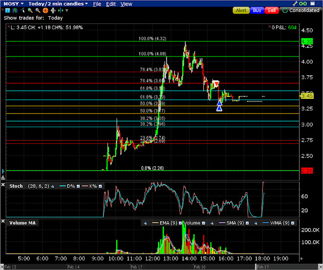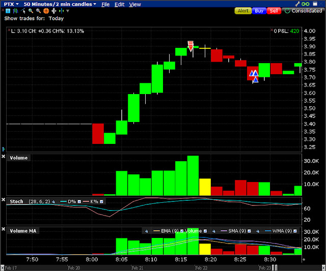 Here’s a stock I traded 3 days ago on February 23rd, 2017 during premarket hours. It’s a stock I’m very familiar with and it had surged on strong premarket volume. As you can see from the red triangles, I short sold into the 3.90’s and then I covered around 3.70’s for a nice 4% gain.