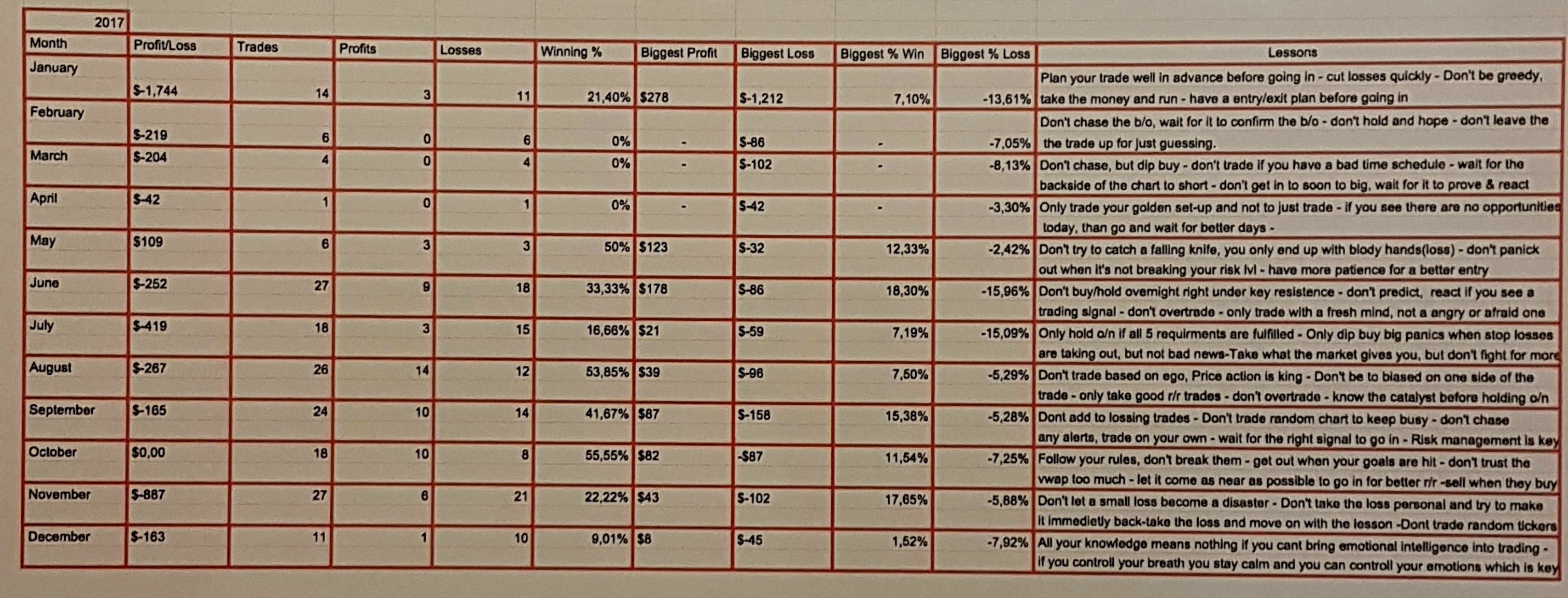 My Trading Year - 2017 Dear 2018, you can thank 2017 and 2016 for your success. Posted Dec 31, 17 3:59 PMbyMarkoVCategories BasicsViews 336 / 2Received 2 Karmas1huperauxano Jan 01, 18 3:32 AMNice spreadsheet for tracking your progress - good luck in 20181Torkers Jan 01, 18 8:51 AMGood notes - preparation is key! GL - study hard!MarkoV Jan 01, 18 9:14 AM@huperauxano @torkers Wish you a successful 2018 too!Join now or log in to leave a comment